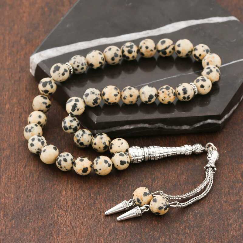 Adını dalmaçyalı cinsi köpeklerden alan bu taş, aynen onlar gibi beyaz zemin üzerine siyah noktalı olarak görülürler. Bu taş, karşınıza çıkan engelleri yıkmanıza yardımcı olurken sizi güven eksikliğinden kurtarır. Bu değerli taş; doğum günü hediyesi, babalar günü veya özel günlerde tercih edilebilecek mükemmel bir seçenektir. Birçok doğal taş gibi jasper taşları da insan sağlığına doğrudan ya da dolaylı olarak fayda sağlamaktadır. Öfke ve kaygı bozukluklarının önüne geçer, bireylerin çok daha mutlu ve dingin hissetmelerini sağlar. Yaydığı enerji sayesinde depresyon belirtilerini yarı yarıya azaltır. Tesbih el emeği ile üretilmiştir. Gümüş ve değerli taşlar nedeniyle belirtilen ürün ağırlığında ± %10 sapma olabilmektedir.Uzunluk : 23.00 cmTane Boy : 0.70 cmOrt Ağırlık : 30 gr