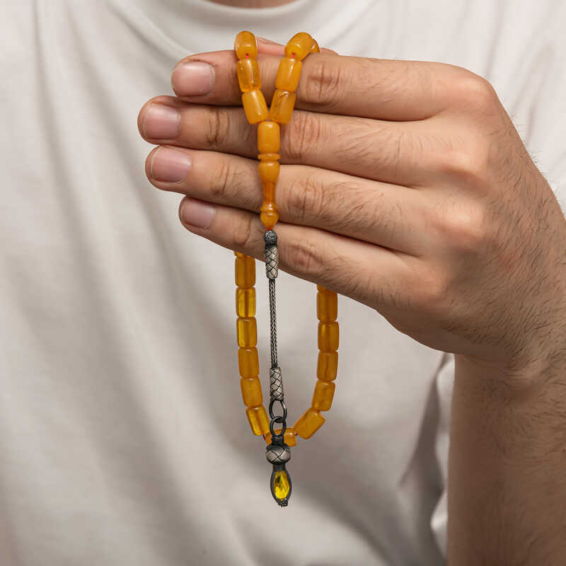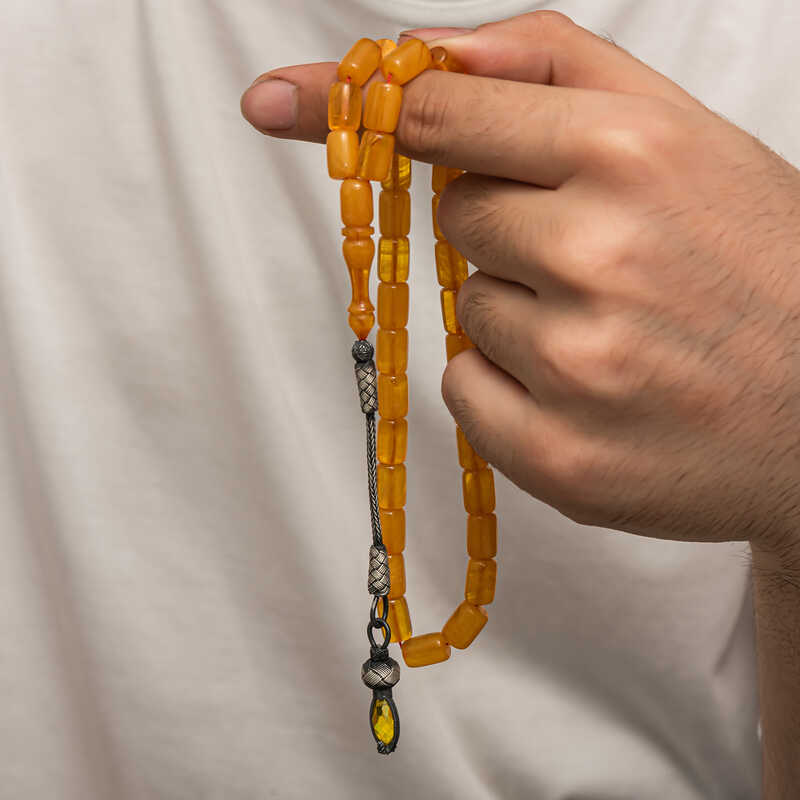 Gümüş 1000 Ayar Kazaz Püsküllü Sıkma Kehribar Tesbih