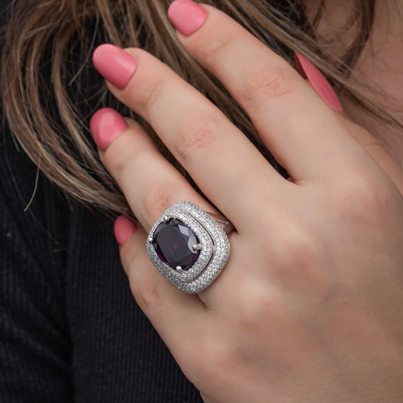 Asırlar boyunca birçok medeniyet tarafından kullanılmış ve günümüze kadar değerini korumuş olan Ametist, hemen her dönem en gözde değerli taşlardan biri olmuştur. Çeşitli kültürlerde “mor yakut”, “mor necef” adlarıyla, kimi zaman da “aşk taşı” olarak tanımlanmıştır. Ametist taşı; tüm değerli taşlar gibi takı, süs ve ziynet eşyalarının yapımında ve oymacılıkta kullanılmaktadır. Takı ve mücevheratta, özellikle şifa ve pozitif enerji verdiğine inanılan koyu mor Ametist öne çıkar. Sadece beden ile temasında değil, taşın bulunduğu ortama yaydığı pozitif enerji de büyük rağbet görmesinde etkilidir. Yüzyıllardır imajınızın simgesi olan takılar, birbirinden özel tasarım koleksiyonlarda sizlerle buluşuyor. Günlük hayatınızdan özel günlerinize kadar her anınızda yanınızda olan gümüş yüzük modelleriyle sizlerde tarzınızı yansıtın. Bu birbirinden farklı dikkat çekici tasarımlar sayesinde ruhunuza hitap eden yaratıcı özgünlüğü ortaya koymaya başlayın. Hayalinizdeki kombinleri gerçeğe dönüştürebileceğiniz gümüş yüzük çeşitleri ile girdiğiniz her ortamda ilgi çekici stiliniz ile ön plana çıkmak artık çok kolay… Ametist taşlı kadın yüzük 925 ayar gümüşten imal edilmiştir, üzerine rodyum kaplama yapılmıştır. Gümüş yüzük modellerimizin tamamı el emeği ile üretilmiştir. Gümüş ve değerli taşlar nedeniyle belirtilen ortalama ürün ağırlığında ± %10 sapma olabilmektedir.