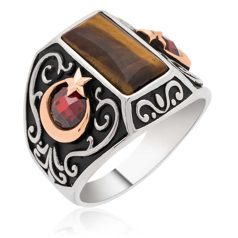 Gümüş Ay Yıldız Armalı Kaplan Gözü Erkek Yüzük