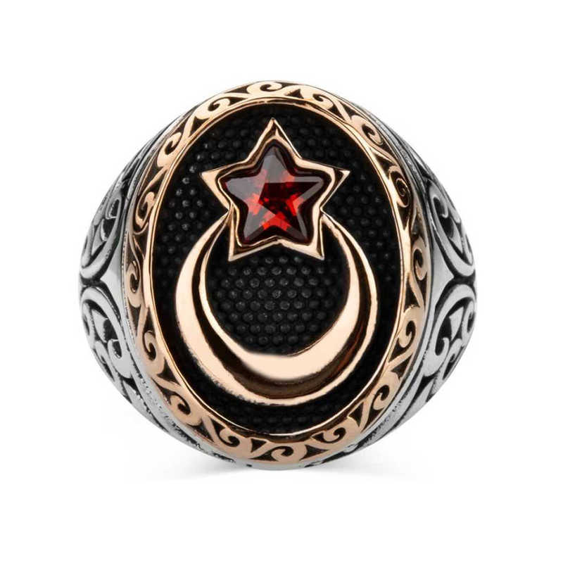 Bu şık ay yıldız erkek yüzük modeli, doğum günü hediyesi, sevgililer günü hediyesi, babalar günü veya özel günlerde tercih edilebilecek mükemmel bir seçenektir. Yüzük 925 ayar gümüşten imal edilmiştir. Gümüş üzerine oksit kaplama yapılmıştır. Diğer erkek yüzüklerde olduğu gibi gümüş ay yıldız erkek yüzük modeli de el emeği ile üretilmiştir. Gümüş ve değerli taşlar nedeniyle belirtilen ortalama ürün ağırlığında ± %10 sapma olabilmektedir.