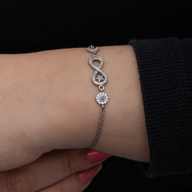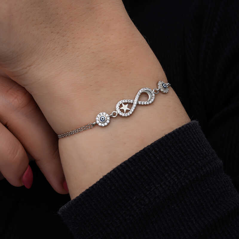 Gümüş Ay Yıldız Nazarlı Sonsuzluk Kadın Bileklik