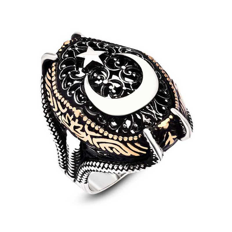 Hilal ve yıldız ya da ay-yıldız; hilal ve hilalin açık ucunda yer alan bir yıldız şeklinden oluşan antik semboldür. Bu sembolün kullanıldığı bayraklara çoğunlukla Akdeniz bölgesi civarında, Orta Doğu ve Orta Asya"da rastlanır. Günümüzde çoğunlukla İslam ülkelerinin bayraklarında kullanılan bir sembol olarak bilinmektedir. Ay- Yıldız simgesi, Türk Bayrağı dahil bir çok bayrakta yer almaktadır. Ay ya da Hilâl, İslâm dini ile özdeşleşmesine rağmen, İslâm öncesi dönemlerde de kullanılmış; Ay- Yıldız ve Güneş motifleri Amerika, Avrupa, Anadolu, Ortadoğu ve Orta Asya panteonunda tarih boyunca yer almıştır. Orta Asya’da İÖ. 5 000’lere ait kaya resimlerinden başlayıp daha sonraki şaman davullarında da benzer şekilde tasvir edilen Ay- Yıldız ve Güneş motifleri, Asyalı Türk- Moğol halklarının evren tasarımı hakkında bilgiler sunar. Fakat Ay ile Yıldız’ın birlikte tasvir edildiği ilk belgeler Mezopotamya’da bugünkü Güney Irak’taki Sümer şehirlerinde ortaya çıkmıştır. Gümüş ay yıldız pençe erkek yüzük modeli severek kullanabileceğiniz ve sevdiklerinize armağan edebileceğiniz bir çok şık bir aksesuardır. Ay yıldız pençe erkek yüzük modeli 925 ayar gümüş kullanılarak imal edilmiştir. Üzerine oksit kaplama yapılmıştır. Oksit kaplama yapılan gümüş ay yıldız erkek yüzük modelleri eskitme bir görünüme kavuşur. Bu yüzükte olduğu gibi tüm gümüş erkek yüzük modelleri tamamen el emeği ile üretilmiştir. Gümüş ve değerli taşlar nedeniyle belirtilen ortalama ürün ağırlığında ± %10 sapma olabilmektedir.