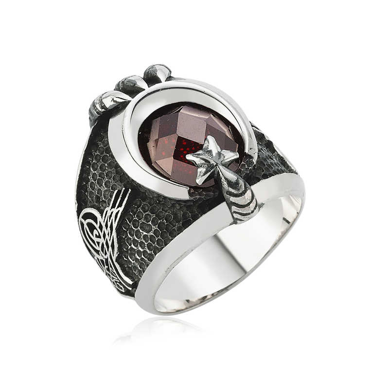 Tuğra Osmanlı devleti padişahlarının şahsi imzalarıdır. Her padişahın imzası birbirinden farklıdır. Günümüzde takılarda sıklıkla kullanılan bir motiftir. Sadece tuğra değil ay yıldız motifi de bayrağımızı simgelediği için sıklıkla kullanılır. Hilal ve yıldız ya da ay-yıldız; hilal ve hilalin açık ucunda yer alan bir yıldız şeklinden oluşan antik semboldür. Bu sembolün kullanıldığı bayraklara çoğunlukla Akdeniz bölgesi civarında, Orta Doğu ve Orta Asya"da rastlanır. Günümüzde çoğunlukla İslam ülkelerinin bayraklarında kullanılan bir sembol olarak bilinmektedir. Ay- Yıldız simgesi, Türk Bayrağı dahil bir çok bayrakta yer almaktadır. Ay ya da Hilâl, İslâm dini ile özdeşleşmesine rağmen, İslâm öncesi dönemlerde de kullanılmış; Ay- Yıldız ve Güneş motifleri Amerika, Avrupa, Anadolu, Ortadoğu ve Orta Asya panteonunda tarih boyunca yer almıştır. Orta Asya’da İÖ. 5000’lere ait kaya resimlerinden başlayıp daha sonraki şaman davullarında da benzer şekilde tasvir edilen Ay- Yıldız ve Güneş motifleri, Asyalı Türk- Moğol halklarının evren tasarımı hakkında bilgiler sunar. Fakat Ay ile Yıldız’ın birlikte tasvir edildiği ilk belgeler Mezopotamya’da bugünkü Güney Irak’taki Sümer şehirlerinde ortaya çıkmıştır. Gümüş ay yıldız tuğra erkek yüzük modeli severek kullanabileceğiniz ve sevdiklerinize armağan edebileceğiniz bir çok şık bir aksesuardır. Ay yıldız tuğra erkek yüzük modeli 925 ayar gümüş kullanılarak imal edilmiştir. Yüzük üzerine oksit kaplama yapılmıştır. Oksit kaplama yapılan gümüş ay yıldız tuğra erkek yüzük modelleri eskitme bir görünüme kavuşur. Gümüş ay yıldız tuğra erkek yüzükte olduğu gibi tüm gümüş erkek yüzük modelleri tamamen el emeği ile üretilmiştir. Gümüş ve değerli taşlar nedeniyle belirtilen ortalama ürün ağırlığında ± %10 sapma olabilmektedir.