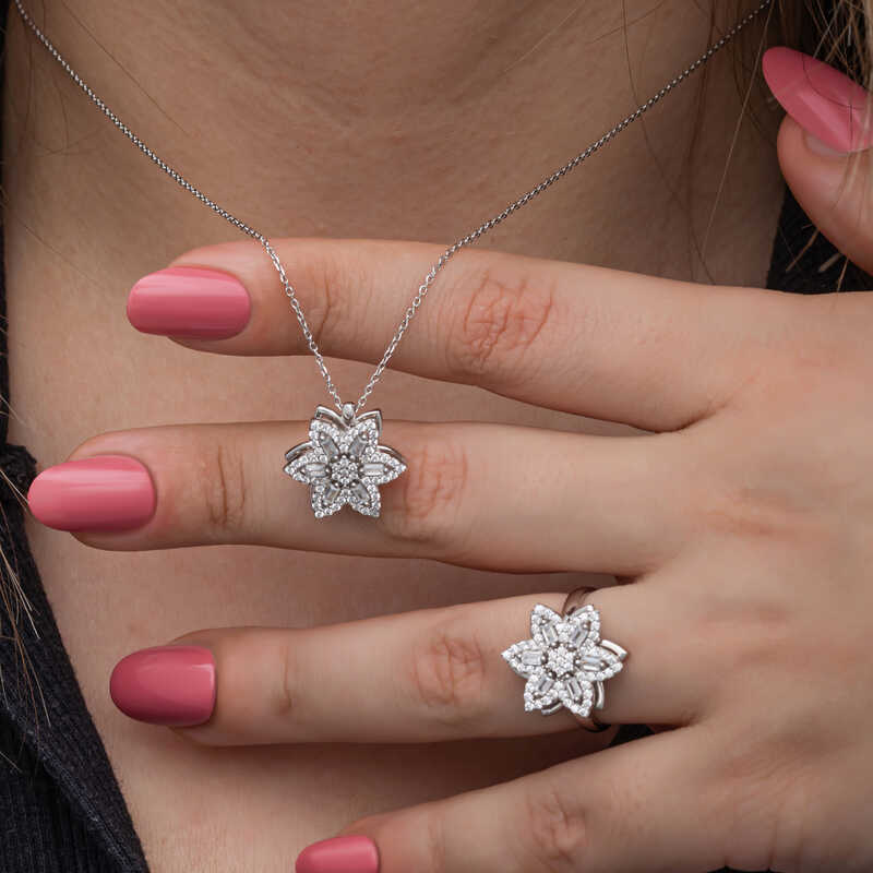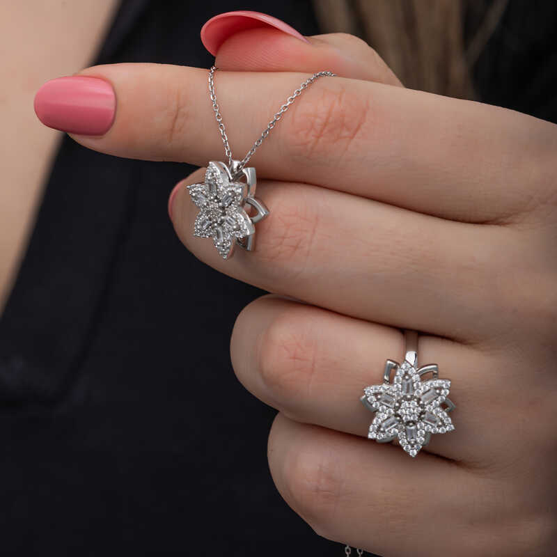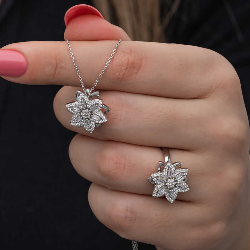 Yıldız, pek çok toplumda ve öğretide şans getirildiğine inanılan uğurlu bir semboldür. Venüs Gezegeninin enerjisini taşır. Venüs Gezegeni, aşk ve aşk enerjisinin de temsilcisidir. Bu şık baget ve zirkon taşlardan oluşan yıldız set; doğum günü hediyesi, sevgililer günü hediyesi veya özel günlerde tercih edilebilecek mükemmel bir seçenektir. Gümüş rodyum ayarlabilir yıldız baget taşlı dönen stres kadın set 925 ayar gümüşten imal edilmiştir. Bu set üzerinde rodyum kaplama vardır. Rodyum kaplama yapılan gümüş kadın set modelleri parlaklığını uzun süre muhafaza eder. Tüm gümüş kadın set modellerimizde olduğu gibi gümüş rodyum ayarlanabilir yıldız baget taşlı stres dönen kadn set modeli de el emeği ile üretilmiştir. Gümüş ve değerli taşlar nedeniyle belirtilen ortalama ürün ağırlığında ± %10 sapma olabilmektedir.