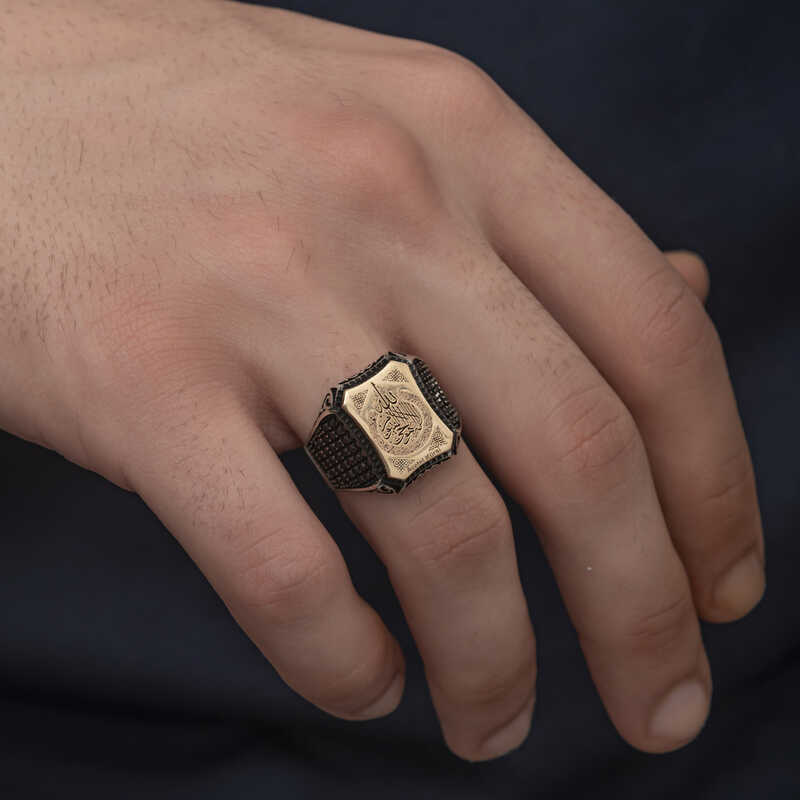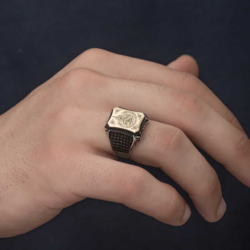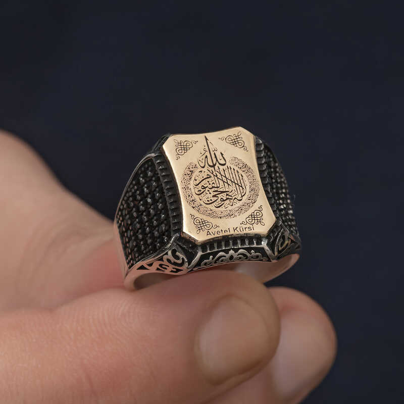 Ayetel kürsi kuran’ı kerimde 2. Süre olan Bakara süresinin 255. ayetidir. Yani ayetel kürsi Kuran-ı Kerimde geçen bir ayettir. İsmini ayet içinde geçen “kürsiyuhus semeveti” kelimesindeki kürsiden almıştır. Bu dua namazda fatiha süresinden sonra okunabileceği gibi Allah"ı tesbih etme yada dua etme amacıyla da okunabilir. Ayete-l Kürsi Fazileti; Allah ki, O’ndan başka ilah yoktur. O Hayydır, Kayyûm"dur. Kendisine ne uyku gelir ne de uyuklama. Göklerde ve yerdekilerin hepsi O’nundur. O’nun izni olmadan katında kim şefaat edebilir? O, kullarının yaptıklarını ve yapacaklarını bilir. (Hiçbir şey O’na gizli kalmaz.) O’nun bildirdiklerinin dışında insanlar, O’nun ilminden hiçbir şeyi tam olarak bilemezler. O’nun kürsüsü gökleri ve yeri içine alır, onları koruyup gözetmek kendisine zor gelmez. O, yücedir, büyüktür. Firuze taş üzerine yazılmış Ayetel Kürsi Yazılı Erkek Yüzük 925 ayar gümüşten imal edilmiştir. Gümüş üzerine rodyum kaplama yapılmıştır. Rodyum kaplama yapılan gümüş erkek yüzük modelleri parlaklığını uzun süre muhafaza eder ve oksitlenmesi gecikir. Gümüş Ayetel Kürsi Yazılı Erkek Yüzük modeli gibi tüm gümüş erkek yüzük modelide el emeği ile üretilmiştir. Gümüş ve değerli taşlar nedeniyle belirtilen ortalama ürün ağırlığında ± %10 sapma olabilmektedir.