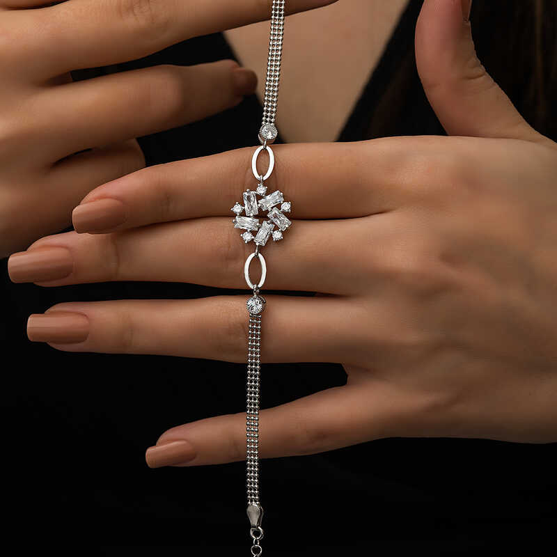 Özel günlerin ve aynı zamanda gündelik giyimin favori aksesuarları arasında yer alan gümüş bileklikler özgün tasarımlarıyla sizlerle buluşuyor. Stilinizi vurgulayabilmenin ve dışarıya yansıtabilmenin en zarif yollarını sizlere sunan bileklik modellerini inceleyerek sizler de günün her anında kullanabileceğiniz bileklik modellerine sahip olabilirsiniz. Gümüş baget taşlı bayan bileklik de bu bileklikler arasında yer almaktadır. Günlük ve özel günlerinizde kullanabileceğiniz baget taşlı bileklik 925 ayar gümüşten üretilmiştir. Üzerine rodyum kaplama yapılmıştır. Rodyum kaplama yapılan gümüş ürünler parlaklığını uzun süre muhafaza eder. Tüm gümüş bileklikler de olduğu gibi gümüş baget taşlı bayan bileklik modeli de el emeği ile üretilmiştir. Gümüş ve değerli taşlar nedeniyle belirtilen ürün ağırlığında ± %10 sapma olabilmektedir.