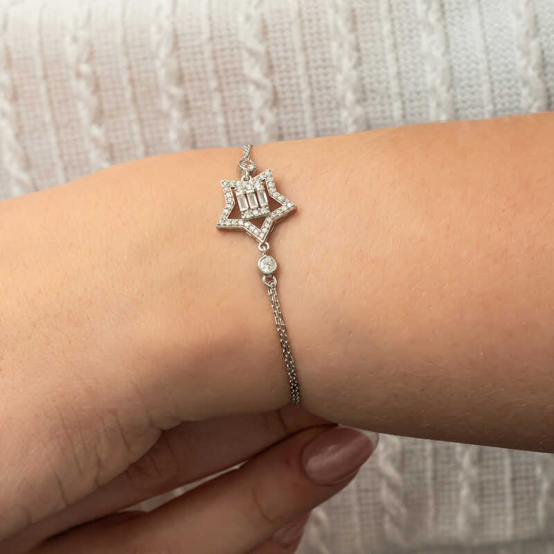 Gecenin parlak ışıltısını anımsatan yıldız, sembolik olarak evrenin sonsuzluğunu, uzaktaki bir noktayı ifade eder. Parıltının, ışığın, aydınlığın ve umudun sembolüdür. Her insan özel, her sevilen eşsizdir. Eşsiz sevginin ömür boyu sürecek birlikteliğin simgesi gümüş yıldız kadın bileklik ile sevdiklerinizi mutlu etmeye ne dersiniz. Gümüş üzerine rodyum kaplama yapılmıştır. Rodyum kaplama yapılan ürünler parlaklığını uzun süre muhafaza eder ve oksitlenmeyi geciktirir. Üzerinde bulunan beyaz taşlar baget ve zirkondur. Gümüş kadın bilekliklerin tamamında olduğu gibi gümüş yıldız kadın bileklik de el emeği ile üretilmiştir. Gümüş ve değerli taşlar nedeniyle belirtilen ortalama ürün ağırlığında ± %10 sapma olabilmektedir.