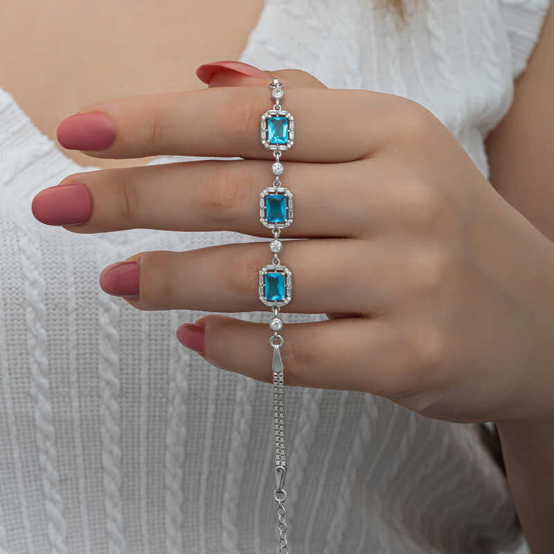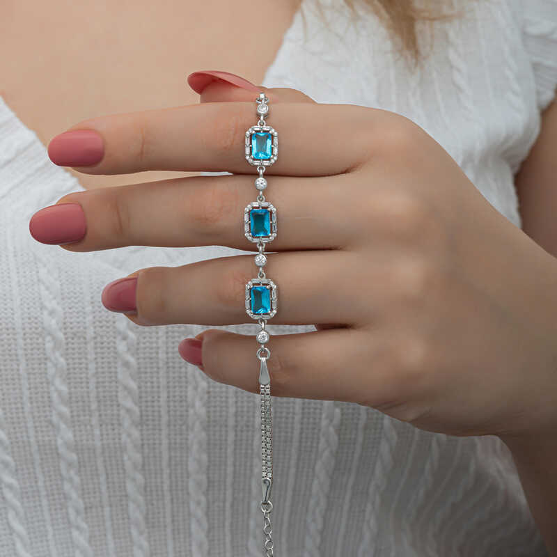 Modaya uyumlu şekilde tasarlanan gümüş baget bileklik modellerini hem gündelik yaşantınızda hem özel gün ve gecelerinizde şık bir şekilde kullanabilirsiniz. Yenilikçi her yaştan kadının beğenisine hitap eden ürünlerle kombinlerinizi tamamlayabilirsiniz. Her biri farklı bir stile hitap edebilen tasarımlarla sizler de spor, klasik ve alternatif giyim tarzlarınıza uygun modellerimizi tercih edebilirsiniz. Bu şık bileklik; doğum günü hediyesi, sevgililer günü hediyesi veya özel günlerde tercih edilebilecek mükemmel bir seçenektir. Gümüş baget turkuaz taşlı kadın bileklik 925 ayar gümüşten imal edilmiştir. Bu bileklik üzerinde rodyum kaplama vardır. Rodyum kaplama yapılan ürünler parlaklığını uzun süre muhafaza eder, oksitlenmesini geciktirir. Tüm gümüş kadın bileklik modellerinde olduğu gibi gümüş baget turkuaz taşlı kadın bileklik modeli de el emeği ile üretilmiştir. Gümüş ve değerli taşlar nedeniyle belirtilen ortalama ürün ağırlığında ± %10 sapma olabilmektedir.