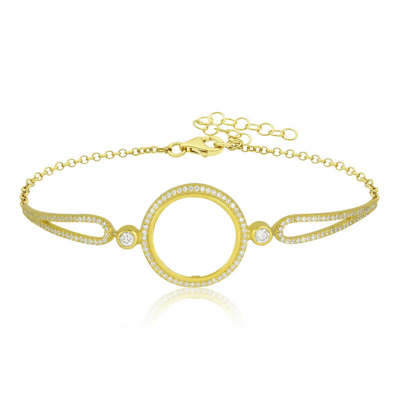 Yuvarlak form deseniyle şıklığı ifade eden gümüş çeyrek takılabilen altın kadın bileklik modeli ile sevginiz, sevdiğiniz kadının teninde hayat bulsun. Genç sevgililerin ve kendini genç hissedenlerin özel günlerde de seçebileceği bu kadın bileklik modeli ile sevdiğinizin bileğini aşkla süsleyin. Sizin olduğu kadar sevdiklerinizin de keyifle takacağı kadın bileklik sevdiğinize en güzel hediyelerden biri olacaktır. Bu kadın bileklik modeli 925 ayar gümüşten imal edilmiştir. Gümüş üzerine altın kaplama yapılmıştır. Altın kaplama yapılan gümüş kadın bileklik modelleri parlaklığını uzun süre muhafaza eder ve oksitlenmesi gecikir. Bileklik üzerinde bulunan beyaz taşlar zirkondur. Tüm kadın bileklik modellerinde olduğu gibi gümüş kadın bileklik modeli de el emeği ile üretilmiştir. Gümüş ve değerli taşlar nedeniyle belirtilen ortalama ürün ağırlığında ± %10 sapma olabilmektedir.