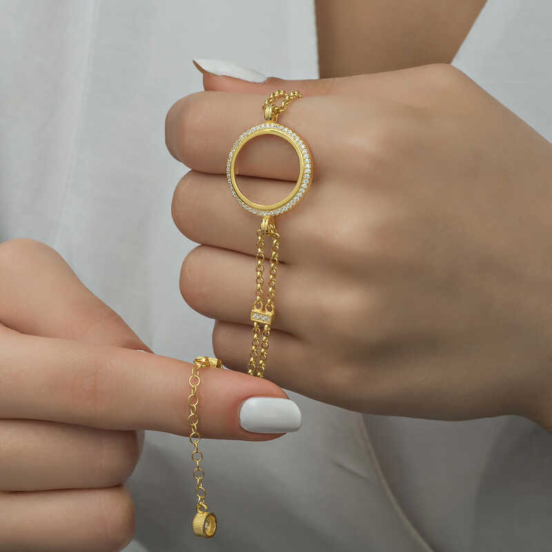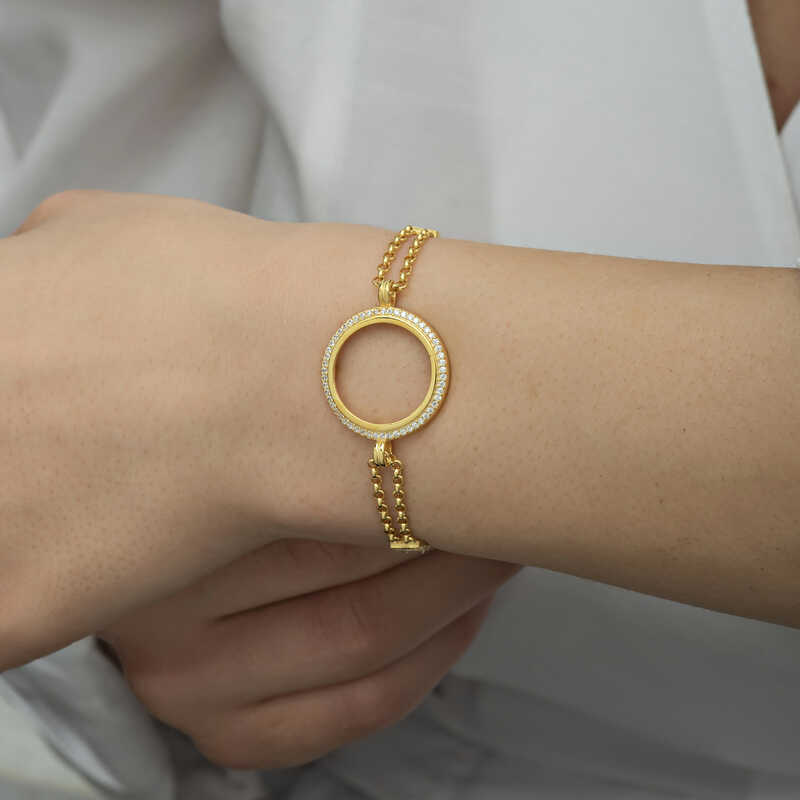 Yuvarlak form deseniyle şıklığı ifade eden gümüş çeyrek takılabilen altın kadın bileklik modeli ile sevginiz, sevdiğiniz kadının teninde hayat bulsun. Genç sevgililerin ve kendini genç hissedenlerin özel günlerde de seçebileceği bu kadın bileklik modeli ile sevdiğinizin bileğini aşkla süsleyin. Sizin olduğu kadar sevdiklerinizin de keyifle takacağı kadın bileklik sevdiğinize en güzel hediyelerden biri olacaktır. Bu kadın bileklik modeli 925 ayar gümüşten imal edilmiştir. Gümüş üzerine altın kaplama yapılmıştır. Altın kaplama yapılan gümüş kadın bileklik modelleri parlaklığını uzun süre muhafaza eder ve oksitlenmesi gecikir. Bileklik üzerinde bulunan beyaz taşlar zirkondur. Tüm kadın bileklik modellerinde olduğu gibi gümüş kadın bileklik modeli de el emeği ile üretilmiştir. Gümüş ve değerli taşlar nedeniyle belirtilen ortalama ürün ağırlığında ± %10 sapma olabilmektedir.