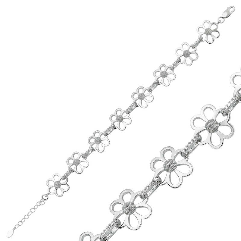 Sevdiklerinize duygularınızı ifade etmenin en özel ve zarif yolu O’na gönderebileceğiniz şık, rengarenk ve mis kokulu çiçeklerdir. Özel günlerde verilecek hediyeler arasında olan çiçek, bu kez gümüş bileklik olarak tasarlandı… En kaliteli, en parlak, en ışıltılı taşlarla hazırlanmış gümüş çiçek bayan bileklik sevgisini bir kez daha anlatmak isteyenleri, sen bir çiçeksin demek isteyenleri bekliyor. Bu özel tasarım çiçek bayan bileklik 925 ayar gümüşten imal edilmiştir. Gümüş üzerine rodyum kaplama yapılmıştır. Rodyum kaplama yapılan gümüş bayan bileklik modelleri parlaklığını uzun süre muhafaza eder ve oksitlenmesi gecikir. Bileklik üzerinde bulunan beyaz taşlar zirkondur. Tüm bayan gümüş bileklik modellerinde olduğu gibi gümüş çiçek bayan bileklik de el emeği ile üretilmiştir. Gümüş ve değerli taşlar nedeniyle belirtilen ürün ağırlığında ± %10 sapma olabilmektedir.