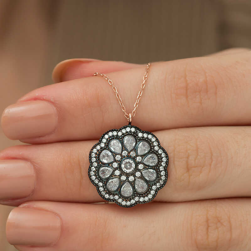 Gümüş Çiçek Desenli Elmas Montür Kolye