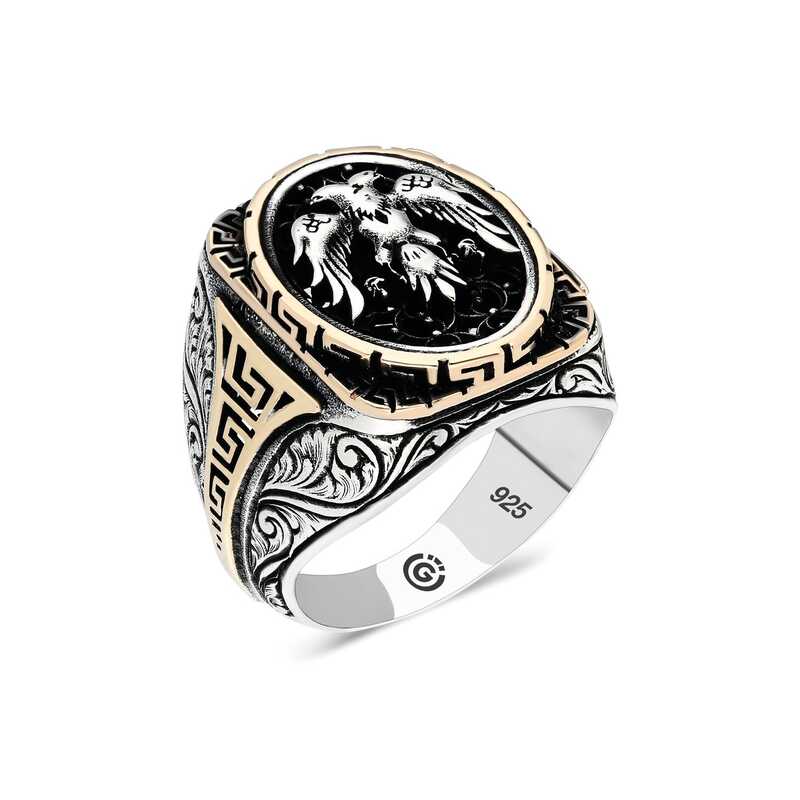 Gümüş Çift Başlı Kartal Oval Erkek Yüzük