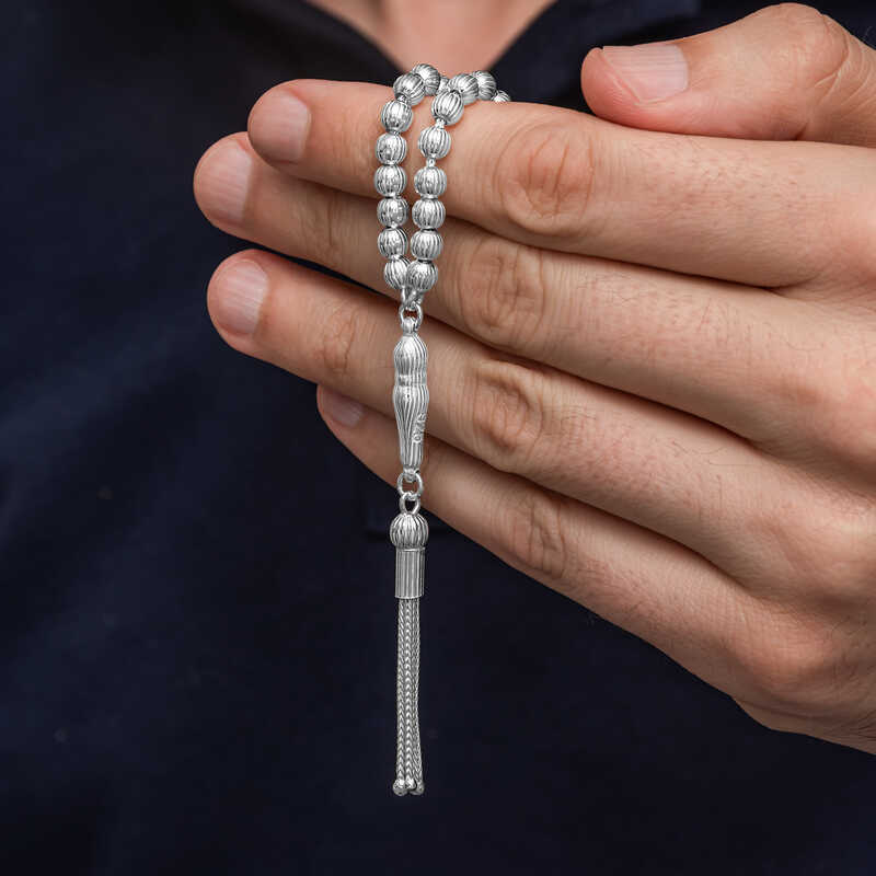 Zarif ve şık tasarımıyla öne çıkan Gümüş Çizgili Yuvarlak Erkek Tesbih,geleneksel estetik ile modern işçiliği bir araya getiriyor.Her bir boncuğu çizgili detaylarla süslenmiş olan bu tesbih,el işçiliği ile üretilmiştir ve %100 925 ayar gümüşten yapılmıştır.Hem günlük kullanım hem de özel günler için ideal bir aksesuardır.Gümüş tesbihi severek kullanabilir;doğum günü,sevgililer günü veya babalar gününde ya da özel günlerde hediye olarak tercih edebilirsiniz.Ürünlerimizin tamamı el emeği ile üretilmiştir.Gümüş ve değerli taşlar nedeniyle belirtilen ortalama ürün ağırlığında ± %10 sapma olabilmektedir.