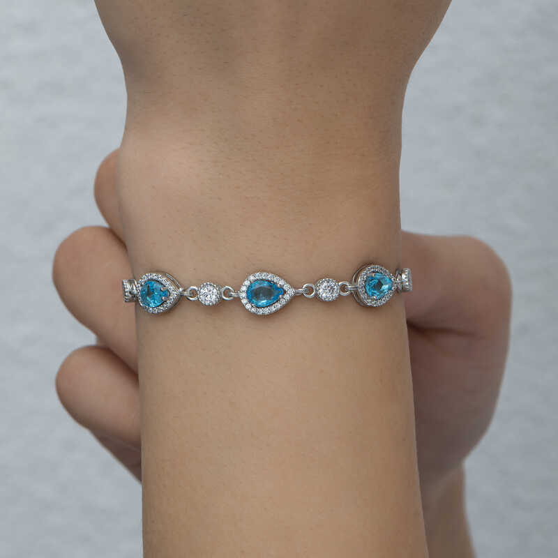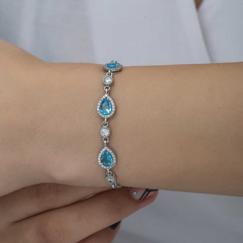 Gündelik hayatta, özel günler ve gecelerde tercih edebileceğiniz ışıl ışıl beyaz ve akuamarin rengi taşları ile yıldızları anımsatan bu bilekliği severek kullanacaksınız. Şık bir görünüm yakalamak isteyen tüm kadınlara hitap eden, modası geçmeyecek olan damla su yolu gümüş bileklik sizleri bekliyor. Gümüş damla su yolu kadın bileklik; doğum günü hediyesi, sevgililer günü hediyesi veya annelere hediye olarak özel günlerde tercih edilebilecek mükemmel bir seçenektir. Gümüş damla su yolu kadın bileklik 925 ayar gümüşten imal edilmiştir. Gümüş üzerine rodyum kaplama yapılmıştır. Rodyum kaplama yapılan kadın bileklikler parlaklığını uzun süre muhafaza eder ve oksitlenmesi gecikir. Tüm kadın bilekliklerde olduğu gibi gümüş damla su yolu kadın bileklik de el emeği ile üretilmiştir. Gümüş ve değerli taşlar nedeniyle belirtilen ortalama ürün ağırlığında ± %10 sapma olabilmektedir.
