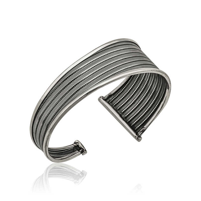 Şık ve fantezi görünümü seven kadınlar için ideal bir seçenektir. Koleksiyonlarda; gösteriş ve şıklığın peşinde olan kadınlar için tamamen el işçiliğiyşe yapılmış bu bilezik her zevke ve konsepte uygun modeli ile sizleri bekliyor. Bu şık modeli; doğum günü hediyesi, sevgililer günü hediyesi olarak özel günlerde tercih edebilirsiniz. Eskitme desenli bayan bilezik modeli 925 ayar gümüşten imal edilmiştir. Gümüş üzerine rodyum kaplama yapılmıştır. Rodyum kaplama yapılan gümüş bayan bilezik modelleri parlaklığını uzun süre muhafaza eder, oksitlenmesi gecikir. Tüm gümüş bayan bilezikler de olduğu gibi bu gümüş eskitme desenli bayan bilezik modeli de el emeği ile üretilmiştir. Gümüş ve değerli taşlar nedeniyle belirtilen ortalama ürün ağırlığında ± %10 sapma olabilmektedir.