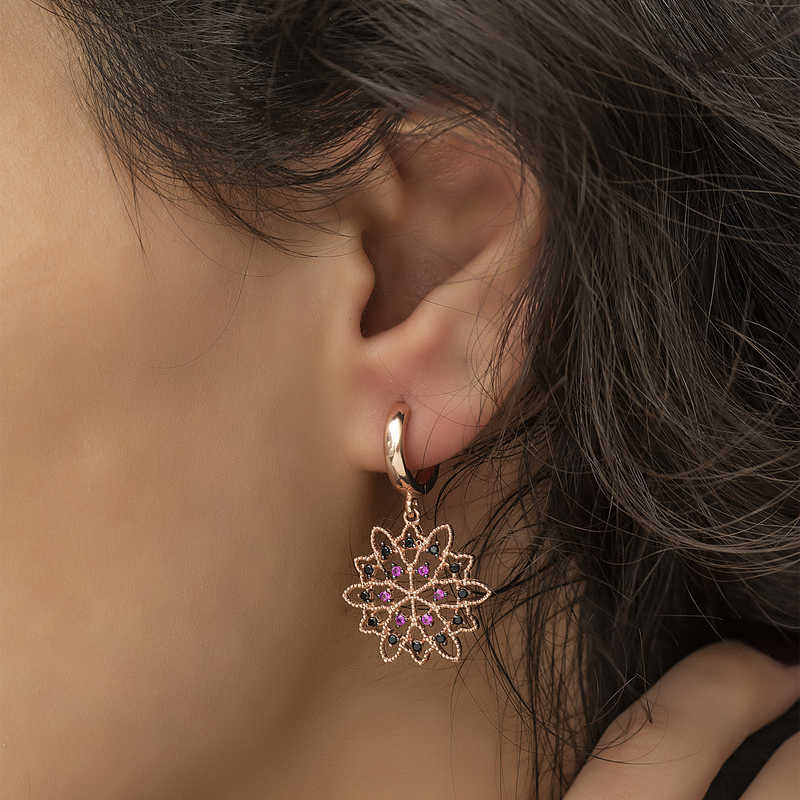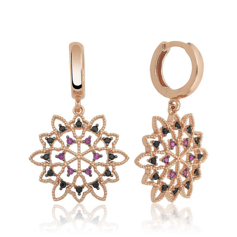 Renkli zirkon taşlar ile süslenmiş geometrik desenli bayan küpe, şık ve ışıltıyı sevenler için tasarlandı. Günün her anında severek kullanabileceğiniz, herkesin beğenisini toplayabilecek ve göz kamaştırabilecek bir üründür. Gümüş geometrik desenli küpe 925 ayar gümüşten imal edilmiştir. Bu küpe üzerine rose kaplama yapılmıştır.Rose kaplama yapılan ürünler parlaklığını uzun süre muhafaza eder ve gümüşü bakır rengine dönüştürür. Üzerinde bulunan taşlar zirkon"dur. Tüm gümüş bayan küpe modellerinde olduğu gibi gümüş geometrik desenli bayan küpe modeli de el emeği ile üretilmiştir. Gümüş ve değerli taşlar nedeniyle belirtilen ortalama ürün ağırlığında ± %10 sapma olabilmektedir. Ürünlerimizin tamamı el emeği ile üretilmiştir.