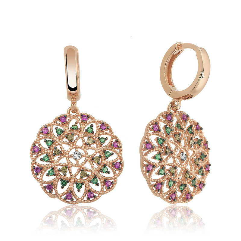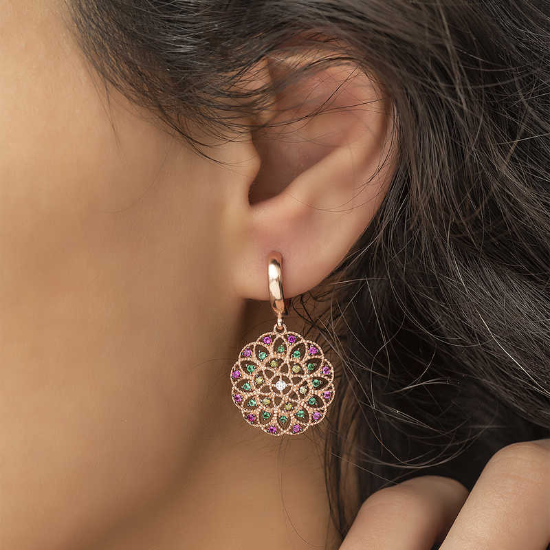 Renkli zirkon taşlar ile süslenmiş geometrik desenli bayan küpe, şık ve ışıltıyı sevenler için tasarlandı. Günün her anında severek kullanabileceğiniz, herkesin beğenisini toplayabilecek ve göz kamaştırabilecek bir üründür. Gümüş geometrik desenli küpe 925 ayar gümüşten imal edilmiştir. Bu küpe üzerine rose kaplama yapılmıştır.Rose kaplama yapılan ürünler parlaklığını uzun süre muhafaza eder ve gümüşü bakır rengine dönüştürür. Üzerinde bulunan taşlar zirkon"dur. Tüm gümüş bayan küpe modellerinde olduğu gibi gümüş geometrik desenli bayan küpe modeli de el emeği ile üretilmiştir. Gümüş ve değerli taşlar nedeniyle belirtilen ortalama ürün ağırlığında ± %10 sapma olabilmektedir. Ürünlerimizin tamamı el emeği ile üretilmiştir.