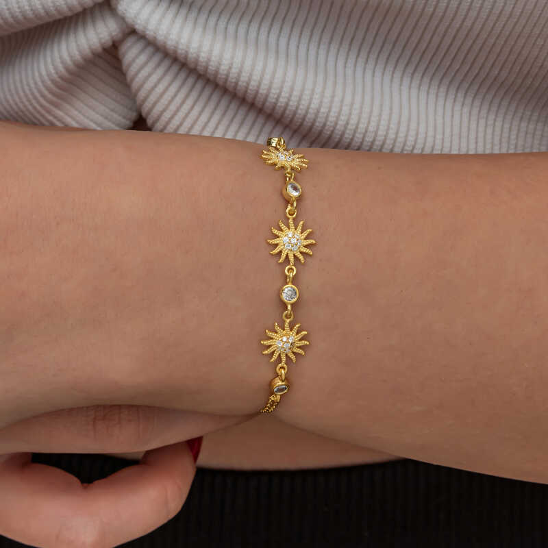Güneş; ışığın, bilginin, iyiliğin, gücün ve yönetimin sembolüdür. Bu ışıl ışıl ve farklı tasarımıyla göz kamaştıran bileklik; 925 ayar gümüşten imal edilmiştir . Gümüş üzerine gold kaplama yapılmıştır.Gold kaplama yapılan gümüş ürünler parlaklığını uzun süre muhafaza eder, oksitlenmesi gecikir. Gümüş güneş bayan bilekliğin üzerinde bulunan taşlar zirkon"dur. Tüm gümüş bileklikler de olduğu gibi güneş bayan bileklik de tamamı el emeği ile üretilmiştir. Ürünlerimizin tamamı el emeği ile üretilmiştir. Gümüş ve değerli taşlar nedeniyle belirtilen ortalama ürün ağırlığında ± %10 sapma olabilmektedir.