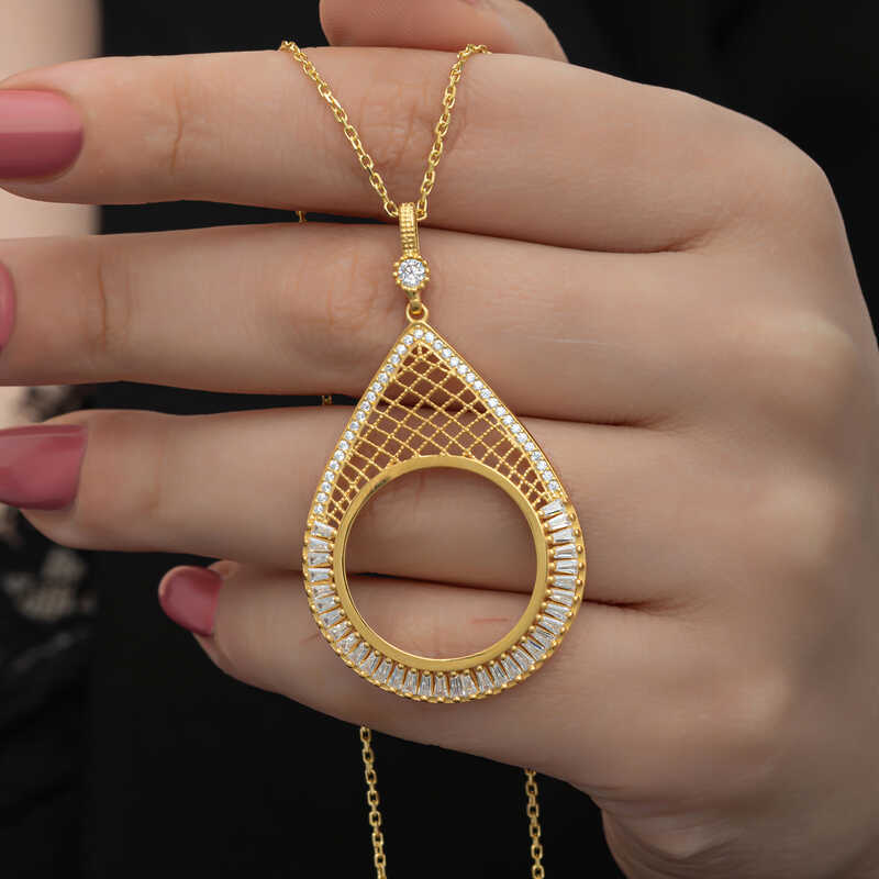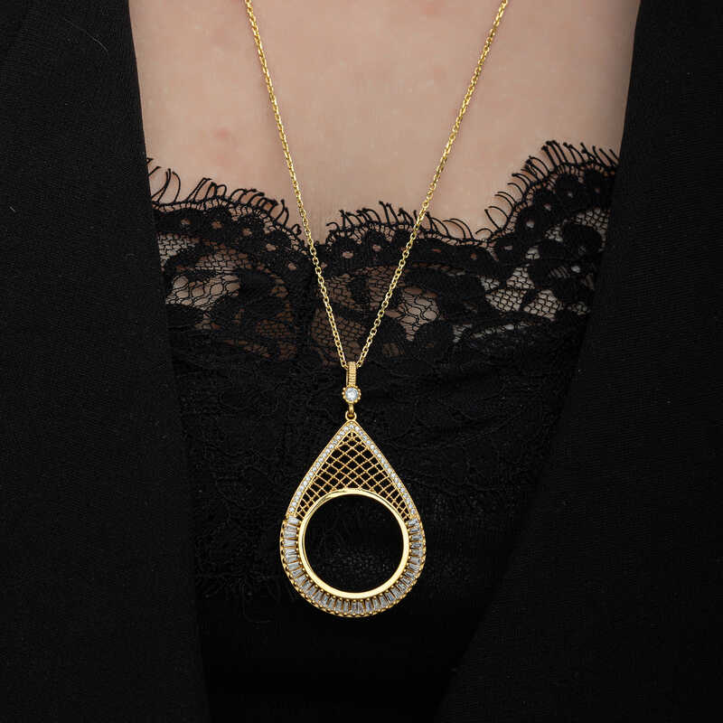 Gümüş Gold Kaplama Damla Yarım Altın Takılabilen Kadın Kolye