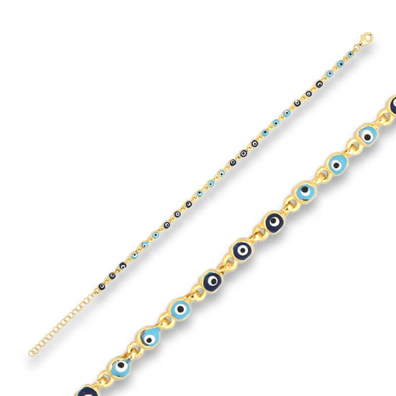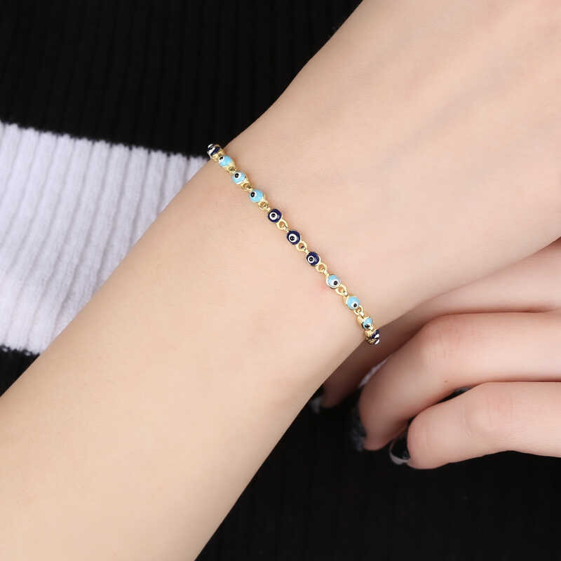 Nazar boncuğunu insanlar uzun yıllardan beri kötü bakıştan korunmak için kullanmışlardır. Kötü bakışların insanlar üzerinde olumsuz etki oluşturmasına karşı bir önlemdir, nazar boncuğu… Bu sebeptendir ki insanlar sevdiklerini korumak için nazar boncuğu takmaktadır. Bu nazar boncuklu bileklik de şıklığı ve zarafeti yansıtıyor. Her dönem sevilen ve şıklığından ödün vermeyen bu modeli; doğum günü hediyesi, sevgililer günü hediyesi veya annelere hediye olarak özel günlerde tercih edebilirsiniz. Gümüş nazar bayan bileklik, 925 ayar gümüşten imal edilmiştir. Gümüş üzerine gold kaplama yapılmıştır. Gold kaplama yapılan gümüş bayan bileklikler parlaklığını uzun süre muhafaza eder, oksitlenmesi gecikir. Üzerinde bulunan taşlar zirkondur. Tüm gümüş bayan bilekliklerinde olduğu gibi bu gümüş nazar boncuklu bayan bileklik modeli de tamamı el emeği ile üretilmiştir. Gümüş ve değerli taşlar nedeniyle belirtilen ortalama ürün ağırlığında ± %10 sapma olabilmektedir.
