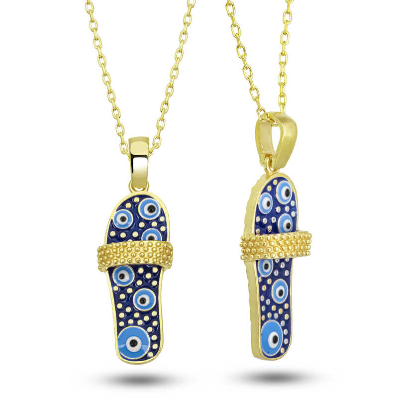 Nazar boncuğunu insanlar uzun yıllardan beri kötü bakıştan korunmak için kullanmışlardır. Kötü bakışların insanlar üzerinde olumsuz etki oluşturmasına karşı bir önlemdir nazar boncuğu… Bu sebeptendir ki insanlar sevdiklerini korumak için nazar boncuğu takmaktadır. Bu şerit terlik kadın kolye de şıklığı ve zarafeti yansıtıyor. Her dönem sevilen ve şıklığından ödün vermeyen bu modeli; doğum günü hediyesi, sevgililer günü hediyesi veya annelere hediye olarak özel günlerde tercih edebilirsiniz. Gümüş nazar şerit terlik kadın kolye, 925 ayar gümüşten imal edilmiştir. Gümüş üzerine gold kaplama yapılmıştır. Gold kaplama yapılan gümüş kadın kolyeler parlaklığını uzun süre muhafaza eder, oksitlenmesi gecikir. Tüm gümüş kadın kolyelerde olduğu gibi bu gümüş nazar şerit terlik kadın kolye modeli de tamamı el emeği ile üretilmiştir. Gümüş ve değerli taşlar nedeniyle belirtilen ortalama ürün ağırlığında ± %10 sapma olabilmektedir.