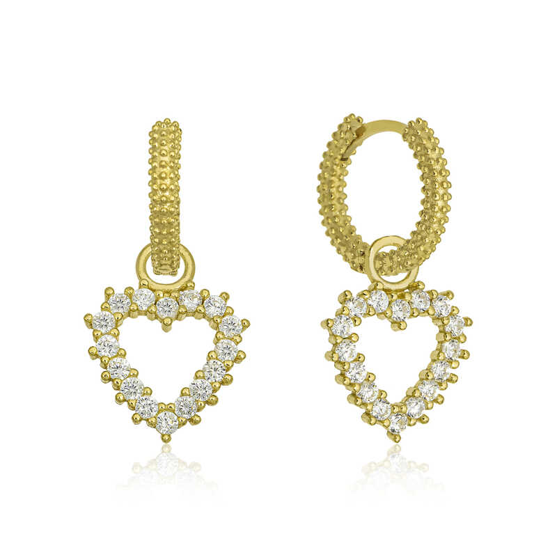 Kalp deseninin hepsi taşlı olan bu harika tasarım kalp küpe modeli 925 ayar gümüşten imal edilmiştir. Kalp tasarımlı küpeler aşkı çağrıştırır. Bu yüzden gümüş küpe güzel bir hediye seçeneği de olabilir. Bu küpe üzerinde zirkon taşlar kullanılmıştır. Gümüşün üzerine oksitlenmesinin gecikmesi ve parlaklığını uzun süre muhafaza etmesi için gold kaplama yapılmıştır. Bu bayan kalp küpe modeli diğer gümüş bayan kalp küpe modellerinde olduğu gibi el emeği ile üretilmiştir. Gümüş ve değerli taşlar nedeniyle belirtilen ortalama ürün ağırlığında ± %10 sapma olabilmektedir.
