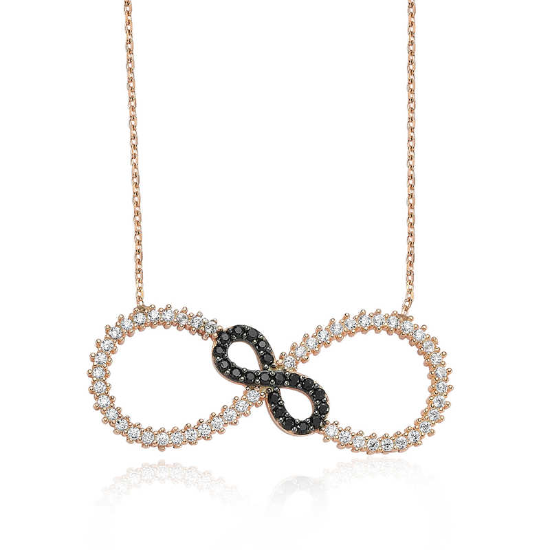 Sevgilinize sonsuz aşkı ifade etmenin en güzel ve en anlamlı yollarından biri sonsuzluk kolyesidir. Sevgilinize hediye edeceğiniz bu iki adet sonsuzluktan oluşan özel kolye ile ona olan sonsuz aşkınızı, sevginizi ifade edebilir sonsuza kadar birlikte olacağınız mesajı verebilirsiniz. Bu harika tasarım sonsuzluk bayan kolye 925 ayar gümüşten imal edilmiştir. Üzerinde bulunan siyah ve beyaz taşlar zirkondur. Kolyenin zinciri gümüştür ve 45 cm. uzunluğundadır. Kolye üzerinde rose altın kaplama vardır. Rose altın kaplama yapılan tüm gümüş kolye modelleri parlaklığını uzun süre muhafaza ederek uzun yıllar boyu ilk günkü gibi kullanmanızı sağlar. Tüm gümüş bayan kolye modellerimiz el emeği ile üretilmiştir. Gümüş ve değerli taşlar nedeniyle ürün ağırlığında ± %5 sapma olabilmektedir.