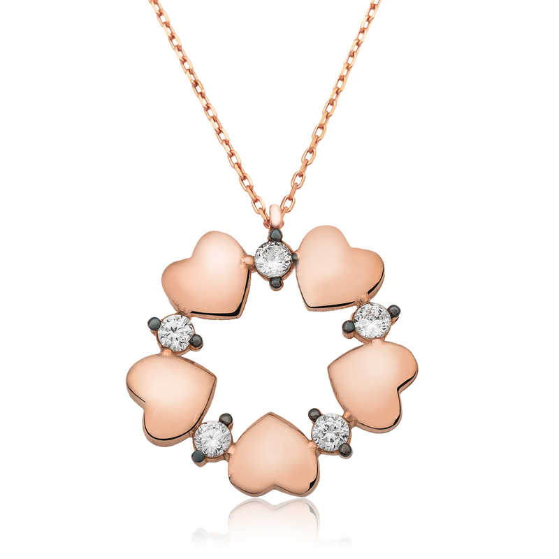 Kalp deseniyle aşkı ifade eden gümüş kalp çemberi bayan kolye ile sevginiz, sevdiğiniz kadının teninde hayat bulsun. Genç sevgililerin özel günlerde seçebileceği gümüş bayan kolye modeli ile sevdiğinizin boynunu aşkla süsleyin. Sizin olduğu kadar sevdiklerinizin de keyifle takacağı bu kolye en güzel hediyelerden biri olacaktır. Kalp çemberi bayan kolye 925 ayar gümüşten imal edilmiştir. Gümüş üzerine altın rose kaplama yapılmıştır. Bu kaplamaların yapıldığı gümüş bayan kolye modelleri parlaklığını uzun süre muhafaza eder ve oksitlenmesi gecikir. Kolye üzerinde bulunan taşlar zirkondur. Gümüş olan zincir boyu ortalama 45 cm"dir. Tüm bayan kolye modellerinde olduğu gibi gümüş kalp çemberi bayan kolye modeli de el emeği ile üretilmiştir. Gümüş ve değerli taşlar nedeniyle belirtilen ürün ağırlığında ± %10 sapma olabilmektedir.