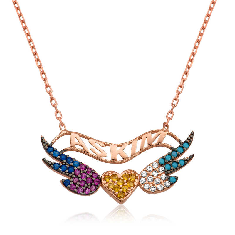 Siz de benim aşkım melek kalpli diyorsanız bu kolye tam size göre… Duygularınızı ifade etmenizde yardımcı olacak bu şık kolye tasarımı en güzel hediye seçeneklerinden biri olacaktır. Kanatlı kalp bayan kolye modeli 925 ayar gümüşten imal edilmiştir. Gümüş üzerine rose altın kaplama yapılmıştır. Rose altın kaplama yapılan gümüş bayan kolye modelleri parlaklığını uzun süre muhafaza eder ve oksitlenmesi gecikir. Kolye üzerinde bulunan taşlar zirkondur. Gümüş kolyenin ortalama boyu 45 cm"dir. Tüm bayan kolye modellerinde olduğu gibi gümüş kanatlı kalp bayan kolye modeli de el emeği ile üretilmiştir. Gümüş ve değerli taşlar nedeniyle belirtilen ürün ağırlığında ± %10 sapma olabilmektedir.