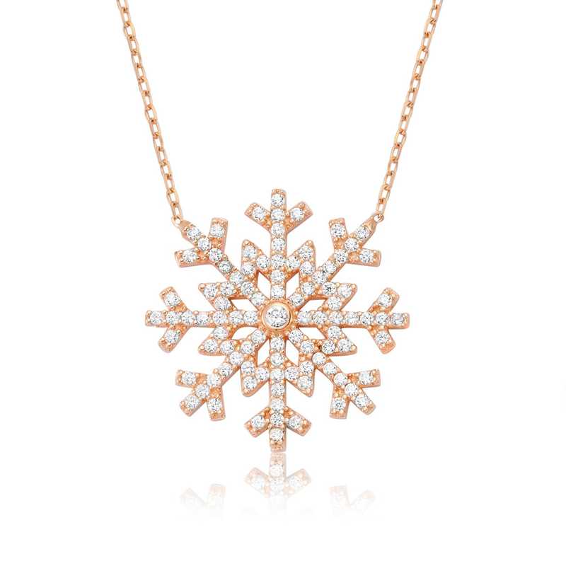 Her kar tanesinden aslında sadece bir tane var. Sevdiğiniz kişiye hediye ettiğiniz kar tanesi kolye ile onun sizin için eşsiz ve biricik olduğunu sessizce dillendirmiş oluyorsunuz. Sizlerde her zevke uygun gümüş kar tanesi bayan kolye modeli ile şıklığınıza ışıltı katın. Kar tanesi bayan kolye 925 ayar gümüşten imal edilmiştir. Gümüş üzerine rose altın kaplama yapılmıştır. Rose altın kaplama yapılan gümüş bayan kolye modelleri parlaklığını uzun süre muhafaza eder ve oksitlenmesi gecikir. Kolye üzerinde bulunan beyaz taşlar zirkondur. Gümüş olan zincir boyu ortalama 45 cm"dir. Gümüş kar tanesi bayan kolye modeli diğer kar tanesi bayan kolye modelleri gibi el emeği ile üretilmiştir. Gümüş ve değerli taşlar belirtilen nedeniyle ürün ağırlığında ± %10 sapma olabilmektedir.