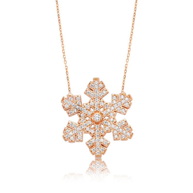 Kar yağdığında yere düşen her kar tanesi birbirinden farklıdır. Yani her bir kar tanesi eşsizdir. Sizde sevdiğinizin yeryüzünde tek olduğunu düşünüyorsanız bu kar tanesi bayan kolye çok anlamlı bir hediye olacaktır. Kar tanesi bayan kolye modeli 925 ayar gümüşten imal edilmiştir. Gümüş üzerine rose altın kaplama yapılmıştır. Rose altın kaplama yapılan gümüş bayan kolye modelleri parlaklığını uzun süre muhafaza eder ve oksitlenmesi gecikir. Kolye üzerinde bulunan beyaz taşlar zirkondur. Gümüş olan zincir boyu ortalama 45 cm"dir. Gümüş kar tanesi bayan kolye modeli diğer gümüş bayan kolye modellerinde olduğu gibi el emeği ile üretilmiştir. Gümüş ve değerli taşlar nedeniyle belirtilen ürün ağırlığında ± %10 sapma olabilmektedir.