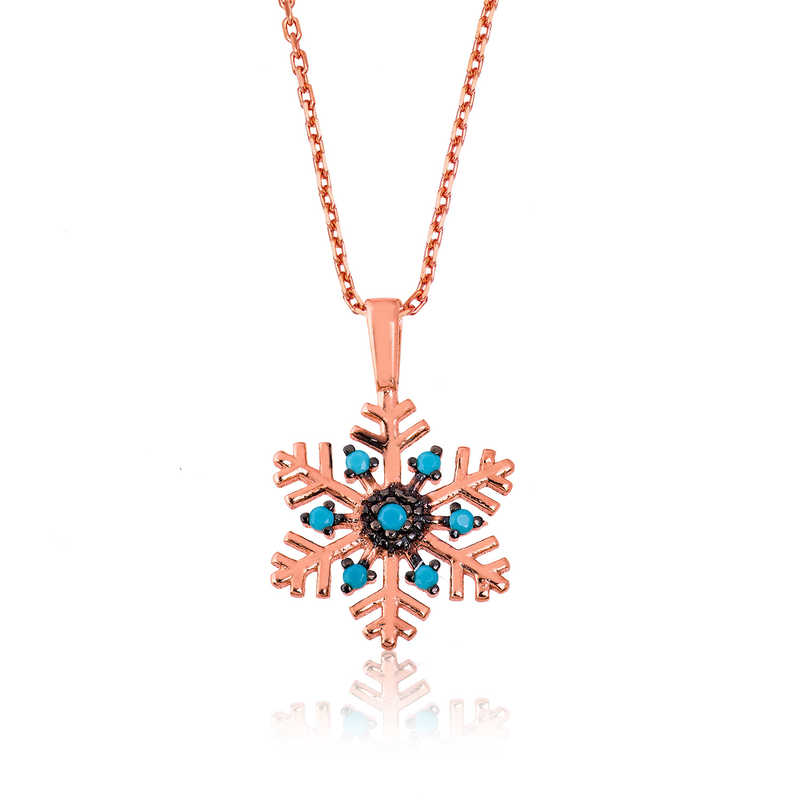 Kadınların ışıltısı, berraklığı kar tanesine benzetilip özel olarak tasarlanmıştır. Kar tanelerinin her birinin bayanlar gibi eşsiz ve ayrı kıymette olması onları özel kılan bir diğer özelliktir. Asilliği her dönemde dikkat çekmeyi başarmıştır. Bunun yanında insanların tıpkı kar taneleri gibi birbirlerine zarar vermeden de mutlu bir şekilde yaşayabileceklerini sembolize etmektedir. Bu şık kolye; doğum günü hediyesi, sevgililer günü hediyesi veya annelere hediye olarak özel günlerde tercih edilebilecek mükemmel bir seçenektir. Kolye, 925 ayar gümüşten imal edilmiştir. Gümüş üzerine rose kaplama yapılmıştır. Rose kaplama yapılan ürünler parlaklığını uzun süre muhafaza eder, gümüşü pembe renge dönüştürür ve oksitlenmesi gecikir. Zincir boyu ortalama 45 cm"dir. Tüm gümüş bayan kolyelerde olduğu gibi bu gümüş kar tanesi bayan kolye de tamamı el emeği ile üretilmiştir. Gümüş ve değerli taşlar nedeniyle belirtilen ortalama ürün ağırlığında ± %10 sapma olabilmektedir.