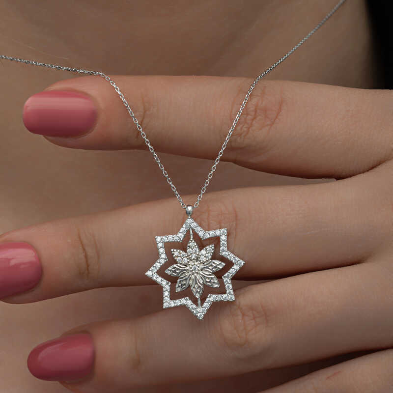Kadınların ışıltısı, berraklığı kar tanesine benzetilip özel olarak tasarlanmıştır. Kar tanelerinin her birinin kadınlar gibi eşsiz ve ayrı kıymette olması onları özel kılan bir diğer özelliktir. Asilliği her dönemde dikkat çekmeyi başarmıştır. Bunun yanında insanların tıpkı kar taneleri gibi birbirlerine zarar vermeden de mutlu bir şekilde yaşayabileceklerini sembolize etmektedir. Bu şık kolye; doğum günü hediyesi, sevgililer günü hediyesi veya annelere hediye olarak özel günlerde tercih edilebilecek mükemmel bir seçenektir. Kolye, 925 ayar gümüşten imal edilmiştir. Gümüş üzerine rodyum kaplama yapılmıştır. Rodyum kaplama yapılan gümüş kadın kolye modelleri parlaklığını uzun süre muhafaza eder, oksitlenmesi gecikir. Zincir boyu ortalama 45 cm"dir. Tüm gümüş kadın kolye modellerinde olduğu gibi bu gümüş kar tanesi kadın kolye de tamamı el emeği ile üretilmiştir. Gümüş ve değerli taşlar nedeniyle belirtilen ortalama ürün ağırlığında ± %10 sapma olabilmektedir.