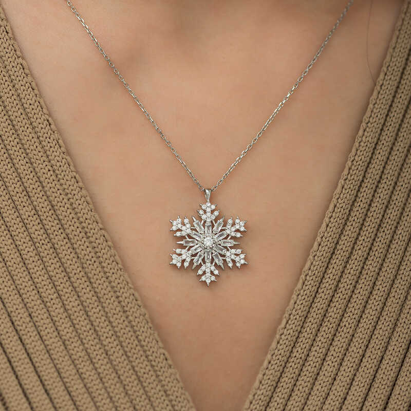 Kadınların ışıltısı, berraklığı kar tanesine benzetilip özel olarak tasarlanmıştır. Kar tanelerinin her birinin bayanlar gibi eşsiz ve ayrı kıymette olması onları özel kılan bir diğer özelliktir. Asilliği her dönemde dikkat çekmeyi başarmıştır. Bunun yanında insanların tıpkı kar taneleri gibi birbirlerine zarar vermeden de mutlu bir şekilde yaşayabileceklerini sembolize etmektedir. Bu şık kolye; doğum günü hediyesi, sevgililer günü hediyesi veya annelere hediye olarak özel günlerde tercih edilebilecek mükemmel bir seçenektir. Kolye, 925 ayar gümüşten imal edilmiştir. Gümüş üzerine rodyum kaplama yapılmıştır. Rodyum kaplama yapılan ürünler parlaklığını uzun süre muhafaza eder ve oksitlenmesi gecikir. Tüm gümüş bayan kolyelerde olduğu gibi bu gümüş kar tanesi bayan kolye de tamamı el emeği ile üretilmiştir. Gümüş ve değerli taşlar nedeniyle belirtilen ortalama ürün ağırlığında ± %10 sapma olabilmektedir.