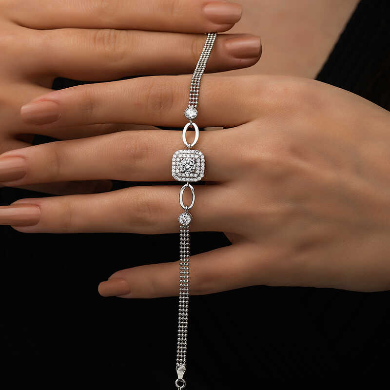Gümüş Kare Montür Beyaz Taşlı Bileklik