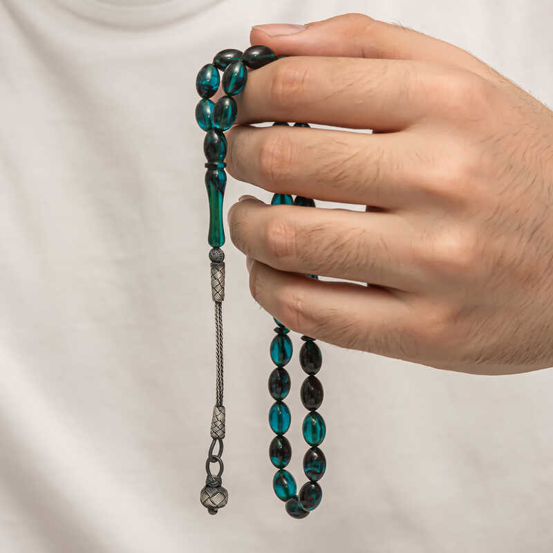 Kehribar, çam ağacı reçinesinin toprak altında uzun yıllar boyunca birikerek oluşan bir maddedir. Hemen hemen taş ile aynı sertliktedir fakat yoğunluğu düşüktür. Çam kokusu yayar. Oluşumu uzun zaman aldığından ve yapay olarak yapılamadığından değerli bir maddedir. Sıkma kehribar ise kehribar taşından farklı olarak onun özelliklerini taşıyan, görüntü itibariyle ona benzeyen fakat gerçek olmayan bir malzemedir. Ülkemizde ve dünyanın bir çok yerinde kehribar taşından çeşitli malzemeler üretilmiştir. Ülkemizde en yaygın olarak tesbih üretilmektedir. Kehribar tesbihler elde ısındıkça kehribar benzeri bir koku verir ve renk değiştirir. Bir çok rengi vardır. Hatta iki rengin birleşiminden oluşan kehribar tesbih modelleri de vardır. Genellikle gümüş püskül ile kullanılır veya sistemli olarak da kullanılabilir. Ülkemizin güzide tesbih ustaları bu malzemeyi sıklıkla işlemek suretiyle çeşitli sanat eserleri meydana getirirler. Bu tesbihler de koleksiyonerler tarafından alınıp satılmaktadır. Gümüş 1000 ayar kazaz püsküllü sıkma kehribar tesbih modeli de günlük hayatta kullanılabilecek çok şık bir tesbih çeşididir. Özel günlerin vazgeçilmez hediyesi sıkma kehribar tesbihler erkekler için doğum günü, sevgililer günü ve babalar günü gibi özel zamanlarda hediye olarak tercih edilebilir. Gümüş kazaz püsküllü sıkma kehribar tesbih modeli diğer kehribar tesbih modellerinde olduğu gibi tamamen el emeği ile imal edilmiştir.