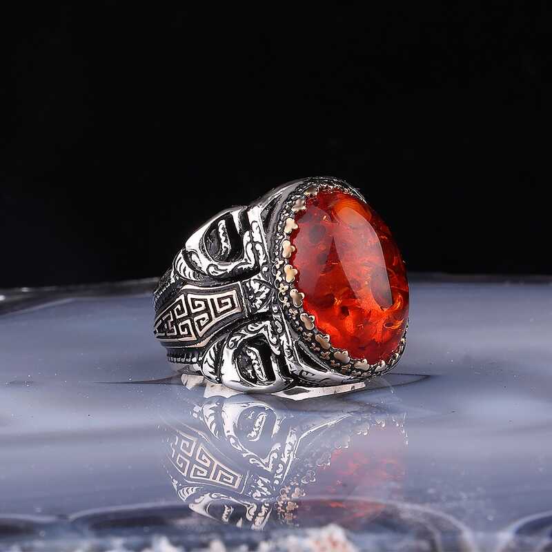 ​Gümüş Kehribar Taşlı Oval Erkek Yüzük