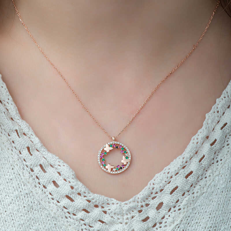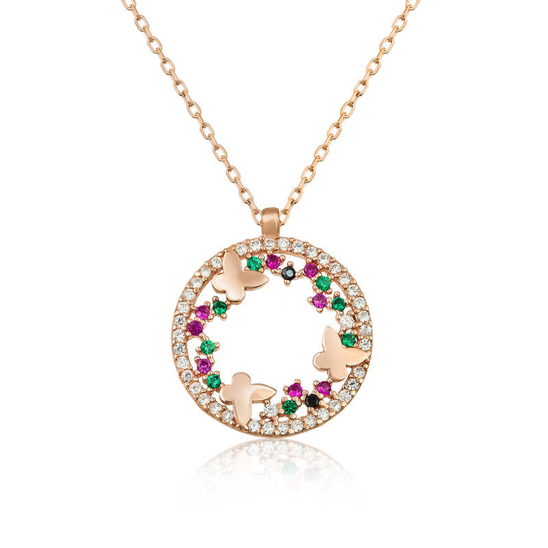 Kelebek; kadınlarca tercih edilen en popüler motiflerden biridir. Sevenlerine doğanın gizemini ve insan hayal gücünün zenginliğini hatırlatır. Özgürlüğü masumiyeti ve saflığı simgeleyen bahar kelebekleri, tertemiz sevginin ve aşkın ifadesidir. Sizin olduğu kadar sevdiklerinizin de keyifle takacağı kelebekler vadisi bayan kolye, sevdiklerinize verebileceğiniz en güzel hediyelerden biri olacaktır. Kolye 925 ayar gümüşten imal edilmiştir. Gümüş üzerine rose altın kaplama yapılmıştır. Rose altın kaplama yapılan gümüş bayan kolyeler parlaklığını uzun süre muhafaza eder ve oksitlenmesini geciktirir. Gümüş olan zincir boyu ortalama 45 cm"dir. Tüm gümüş bayan kolyelerde olduğu gibi gümüş kelebek vadisi bayan kolye modeli de el emeği ile üretilmiştir. Gümüş ve değerli taşlar nedeniyle belirtilen ortalama ürün ağırlığında ± %10 sapma olabilmektedir.