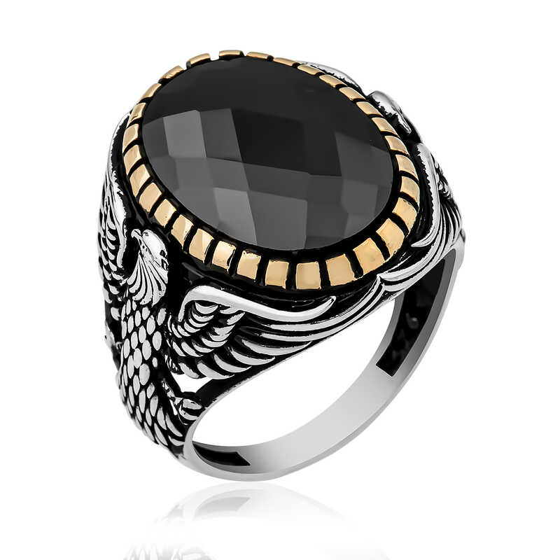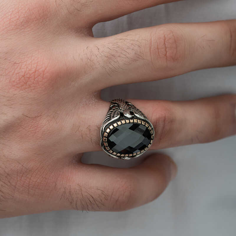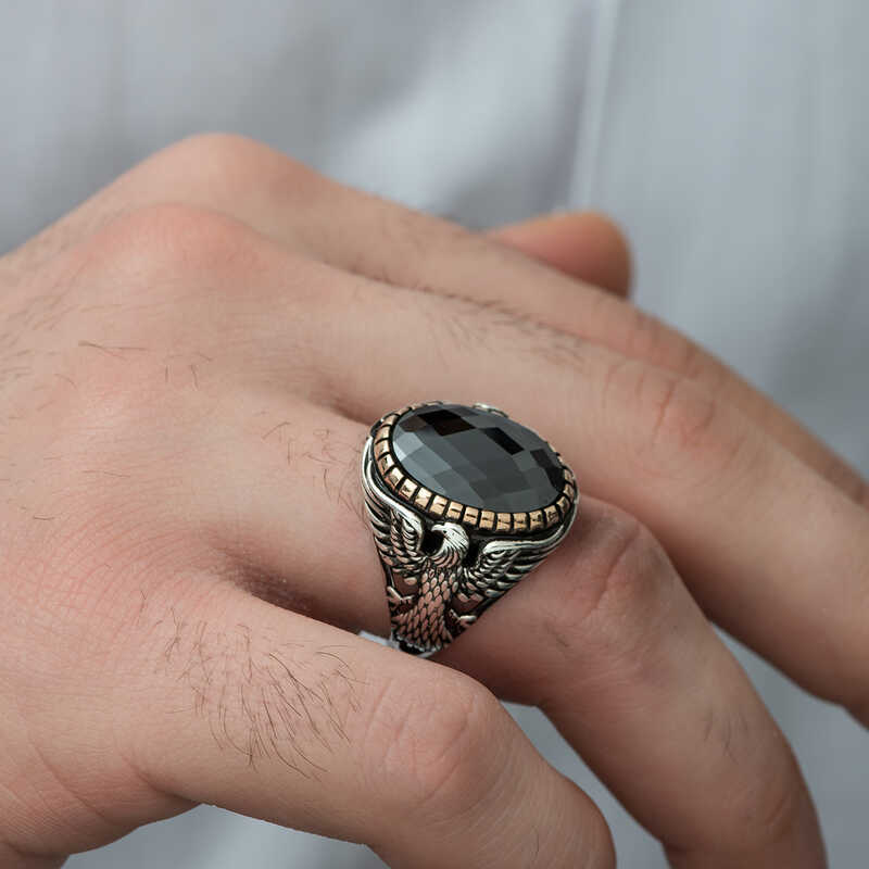 Kuşların kralı olan ve savaşmak üzere dünyaya inen kartal, özellikle savaşçı ve güçlü olmasıyla tanınır; bu yüzden pek çok ulusun sembolü olmuştur. Bu derin anlamdan esinlenerek oluşturulan kesme taşlı iki yanında kartal figürü yer alan erkek yüzüğü; kendinize ya da sevdiklerinize doğum gününde, babalar gününde ve özel günlerde hediye edebilirsiniz. Bu şık erkek yüzük 925 ayar gümüşten imal edilmiştir. Gümüş üzerine oksit kaplama yapılmıştır. Oksit kaplama yapılan yüzükler otantik bir görünüme sahip olur. Tüm erkek yüzüklerde olduğu gibi gümüş kesme taşlı kartal figürlü erkek yüzük de el emeği ile üretilmiştir. Gümüş ve değerli taşlar nedeniyle ürün ağırlığında ± %10 sapma olabilmektedir.