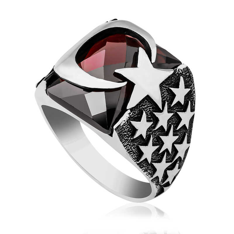 ​Gümüş Kırmızı Kesme Taşlı Ay Yıldız Erkek Yüzük