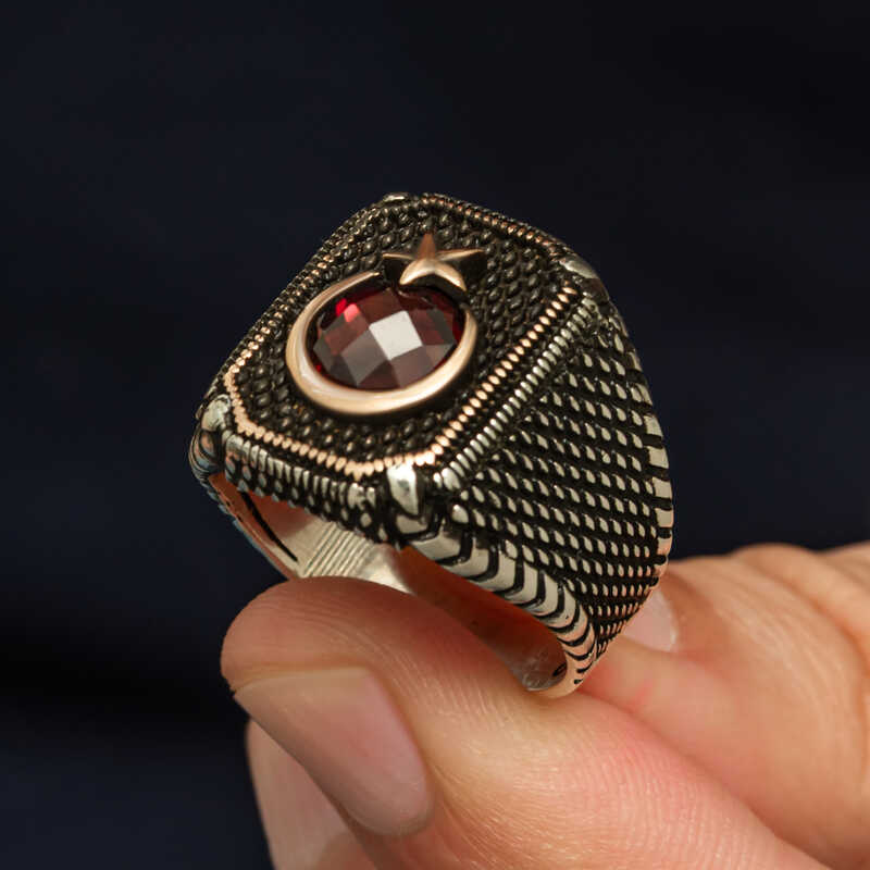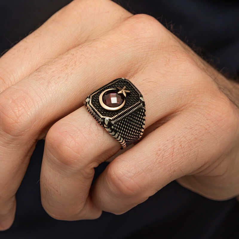 Şıklığı ve anlamlı tasarımıyla öne çıkan bu erkek yüzük,üstün kalite gümüş kullanılarak işlenmiştir.Zarif ay ve yıldız motifleriyle süslenmiş bu yüzük,göz alıcı kırmızı taş detaylarıyla tamamlanmıştır.Her detayında özen ve ustalık barındıran bu aksesuar,stilini tamamlamak isteyen erkekler için mükemmel bir tercih.Kendinize yada sevdiklerinize doğum gününde,babalar gününde yada özel günlerde hediye edebilirsiniz. Gümüş üzerine oksit kaplama yapılmıştır. Oksit kaplama yapılan gümüş erkek yüzük modelleri parlaklığını uzun süre muhafaza eder, oksitlenmesi gecikir. Gümüş ve değerli taşlar nedeniyle belirtilen ortalama ürün ağırlığında ± %10 sapma olabilmektedir.