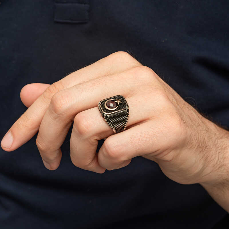 Gümüş Kırmızı Taşlı Ay Yıldız Erkek Yüzük
