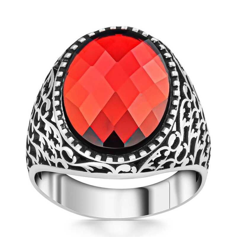 Gümüş Kırmızı Zirkon Taşlı Oval Erkek Yüzük