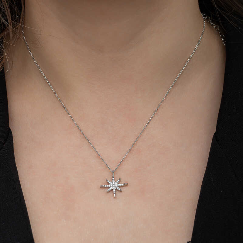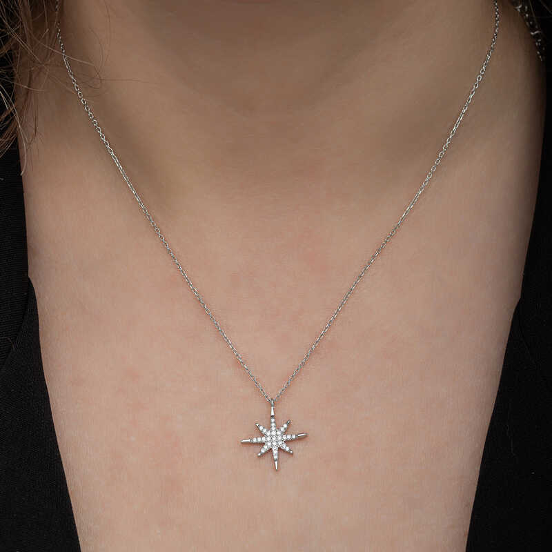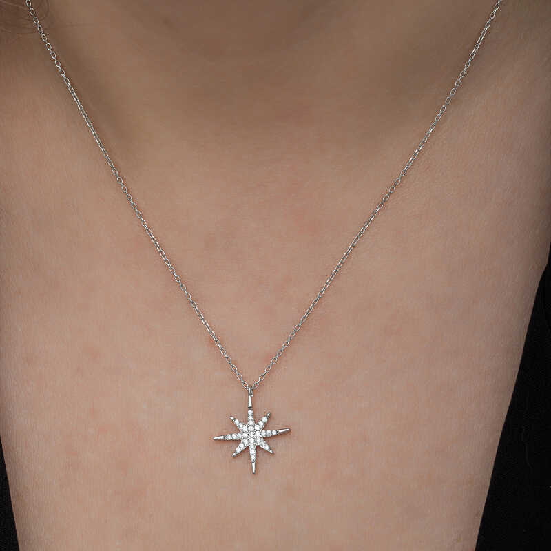 Kutup yıldızı milyonlarca yıldızdan sadece biridir ama aydan en çok etkilenen yıldızdır. Tek isteği aya kendisini beğendirmektir. Ağladıkça parıldar onun da yüreği ve ayın ne kadar soğuk olduğunu düşünür. Onun yerine üşür. Dünya üzerinde görüldüğü her anı aslında onun gerçeğe dönüşen düşüdür. Gökyüzü ne kadar büyükse kutup yıldızı o kadar küçüktür. Kutup yıldızı ulaşamaz aya ne kadar hızlı ilerlese de, ne de ay güneşe. Güneş sıcağından vazgeçip dönmez yüzünü ona. Siz de kıyamete kadar bitmeyecek aşkınızı bu anlamlı kutup yıldızı kolye ile taçlandırın. Bu şık kolye modeli 925 ayar gümüşten imal edilmiştir. Gümüş üzerine rodyum kaplama yapılmıştır. Rodyum kaplama yapılan gümüş kolyeler parlaklığını uzun süre muhafaza eder ve oksitlenmeyi geciktirir. Üzerinde bulunan taşlar zirkondur. Zincir boyu ortalama 45 cm"dir. Ürünlerimizin tamamı el emeği ile üretilmiştir. Gümüş ve değerli taşlar nedeniyle belirtilen ortalama ürün ağırlığında ± %10 sapma olabilmektedir.