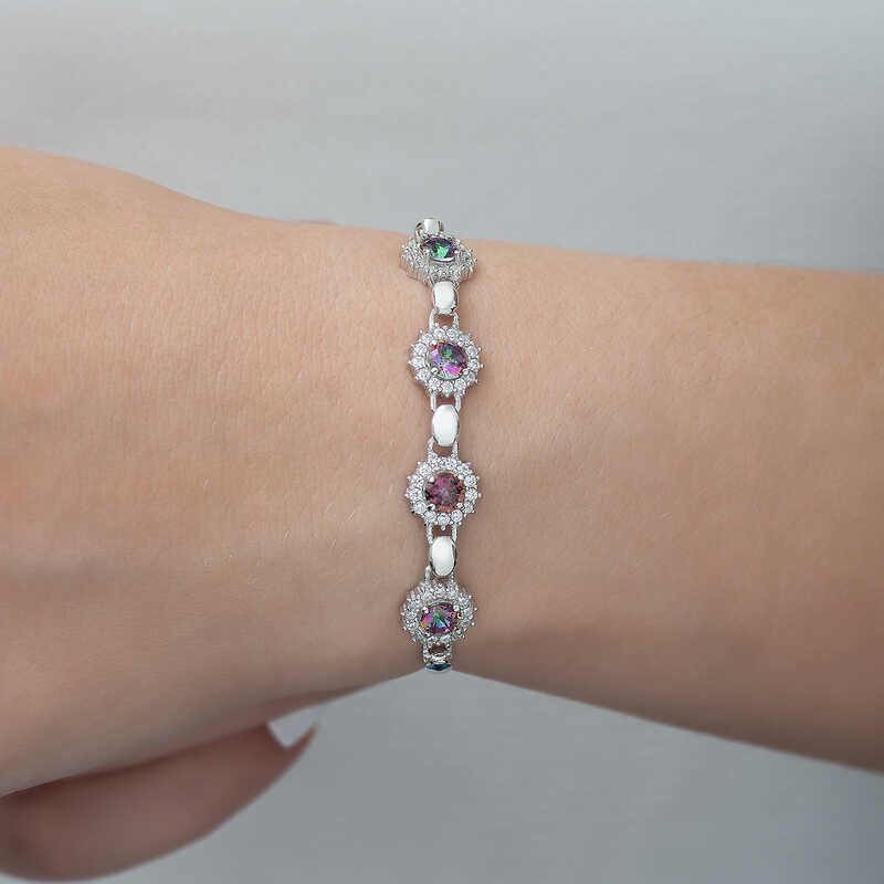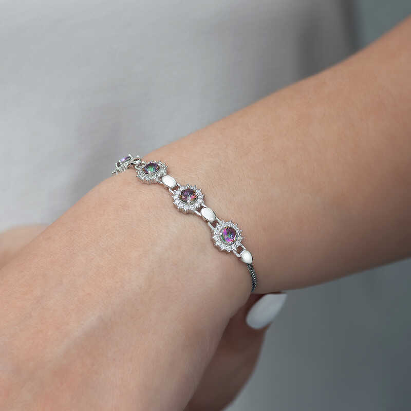 Gümüş ürünlerde her zevke hitap eden bileklik modelleri yer alıyor.. Geleneksel tarzda bileklik sevenler için daha sade ve otantik motiflerin yer aldığı modeller de koleksiyonda zevkinize sunuluyor. Gösterişli takılar tercih edenler için opal, firuze, mistik topaz, zultanit gibi renkli taşlardan oluşan modellere yer veriliyor. Gümüş bileklik tasarımları, sade ve düz renk tercih edilen kıyafetlere hoş bir hava katıyor. Stilinizi vurgulayabilmenin ve dışarıya yansıtabilmenin en zarif yollarını sizlere sunan bileklik modellerini inceleyerek sizler de günün her anında kullanabileceğiniz bileklik modellerine sahip olabilirsiniz. Gümüş mistik topaz taşlı bayan bileklik 925 ayar gümüşten imal edilmiştir. Bu bileklik üzerine rodyum kaplama yapılmıştır. Rodyum kaplama yapılan ürünler parlaklığını uzun süre muhafaza eder. Üzerinde bulunan taşlar zirkon ve mistik topazdır. Tüm gümüş bayan bileklik modellerinde olduğu gibi gümüş mistik topaz taşlı bayan bileklik modeli de el emeği ile üretilmiştir. Bilekliğin uzunluğu 19 cm"dir. Gümüş ve değerli taşlar nedeniyle belirtilen ortalama ürün ağırlığında ± %10 sapma olabilmektedir.