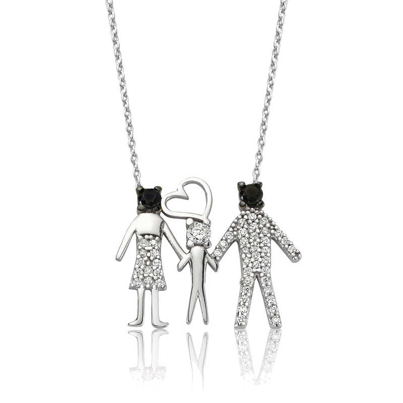 El ele tutuşan anne, baba ve çocuktan oluşan bu harika tasarım kolye 925 ayar gümüşten imal edilmiştir. Bu kolye üzerinde bulunan siyah ve beyaz taşlar zirkondur. Ailenize olan sevginizi bir gün değil her gün anlatma fırsatını bu mutlu aile kolyesi ile yakalayabilirsiniz. Ailesinin mutluluğunu boynunda taşımak isteyenler için kaçırılmayacak bir firsat. Bu gümüş kolye modeli üzerinde rodyum kaplama vardır. Rodyum kaplama yapılan tüm gümüş bayan kolye modelleri parlaklığını uzun süre muhafaza eder. Gümüş zincir uzunluğu ortalama 45 cm’dir. Bu tasarım gümüş mutlu aile kolyesi özel hediye kutusunda gönderilecektir. Tüm gümüş modellerimiz el emeği ile üretilmiştir. Gümüş ve değerli taşlar nedeniyle ürün ağırlığında ± %10 sapma olabilmektedir.
