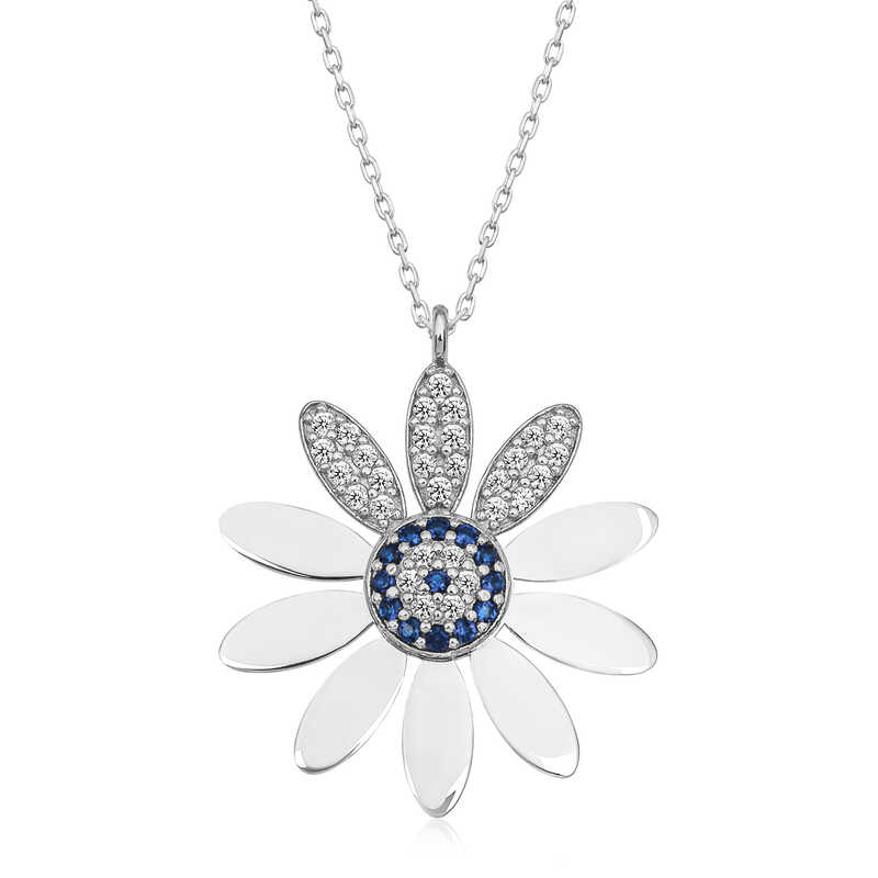 Papatya çiçeği temiz sevgi anlamını ifade eder. En büyük özelliklerinden biri her sapında bir tane olmasıdır. Bu güzellik tasarlanarak ortaya çıkan bu ışıl ışıl kolye zirkon taşlarla süslendi… Bu şık kolye; doğum günü hediyesi, sevgililer günü hediyesi veya annelere hediye olarak özel günlerde tercih edilebilecek mükemmel bir seçenektir. Gümüş nazar papatya kadın kolye 925 ayar gümüşten imal edilmiştir. Bu kolye üzerinde rodyum kaplama vardır. Rodyum kaplama yapılan ürünler parlaklığını uzun süre muhafaza eder. Üzerinde bulunan ışıl ışıl taşlar zirkondur. Tüm gümüş kadın kolye modellerinde olduğu gibi gümüş nazarlı papatya kadın kolye modeli de el emeği ile üretilmiştir. Gümüş ve değerli taşlar nedeniyle belirtilen ortalama ürün ağırlığında ± %10 sapma olabilmektedir.