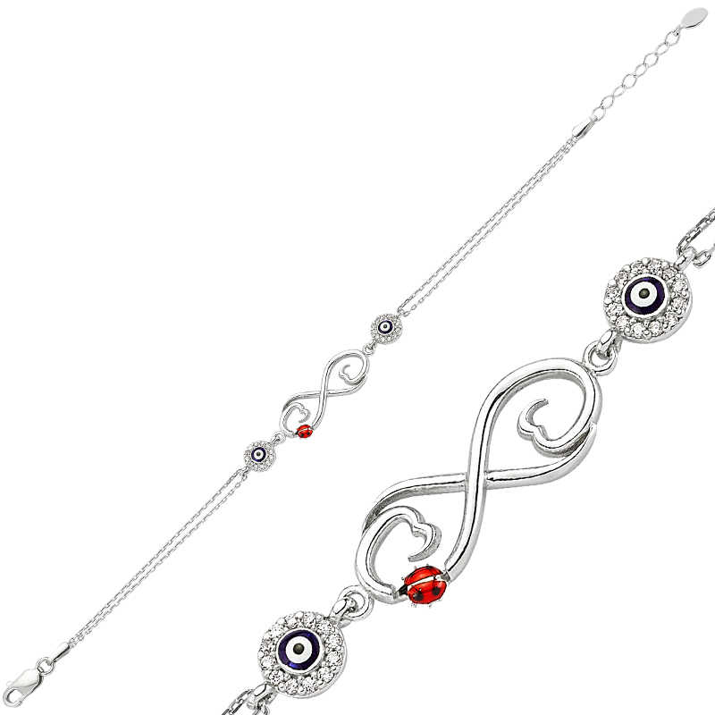 Sevdiklerinize sonsuz aşkı ifade etmenin en güzel en anlamlı yollarından biride bu nazar boncuklu sonsuzluk bilekliktir. Sevdiklerinize hediye edeceğiniz bu özel gümüş bileklik ile ona olan sonsuz sevginizi ifade edebilir sonsuza kadar birlikte olacağınız mesajı verebilirsiniz. 925 ayar gümüşten imal edilmiştir. Gümüş üzerine rodyum kaplama yapılmıştır. Rodyum kaplama yapılan bayan gümüş bileklik modelleri parlaklığını uzun süre muhafaza eder, oksitlenmesi gecikir. Tüm bileklik modellerimiz el emeği ile üretilmiştir. Gümüş ve değerli taşlar nedeniyle belirtilen ortalama ürün ağırlığında ± %10 sapma olabilmektedir.